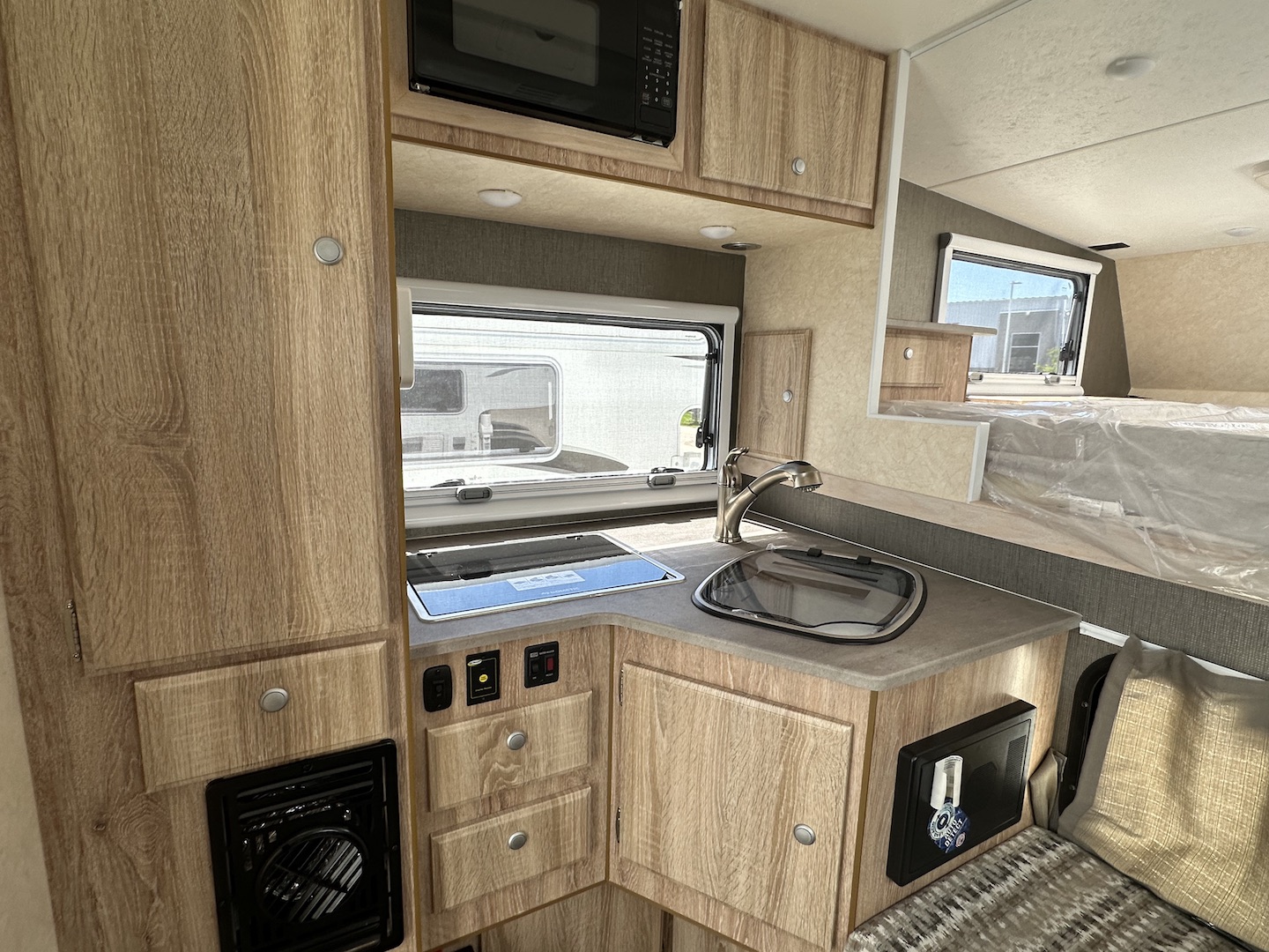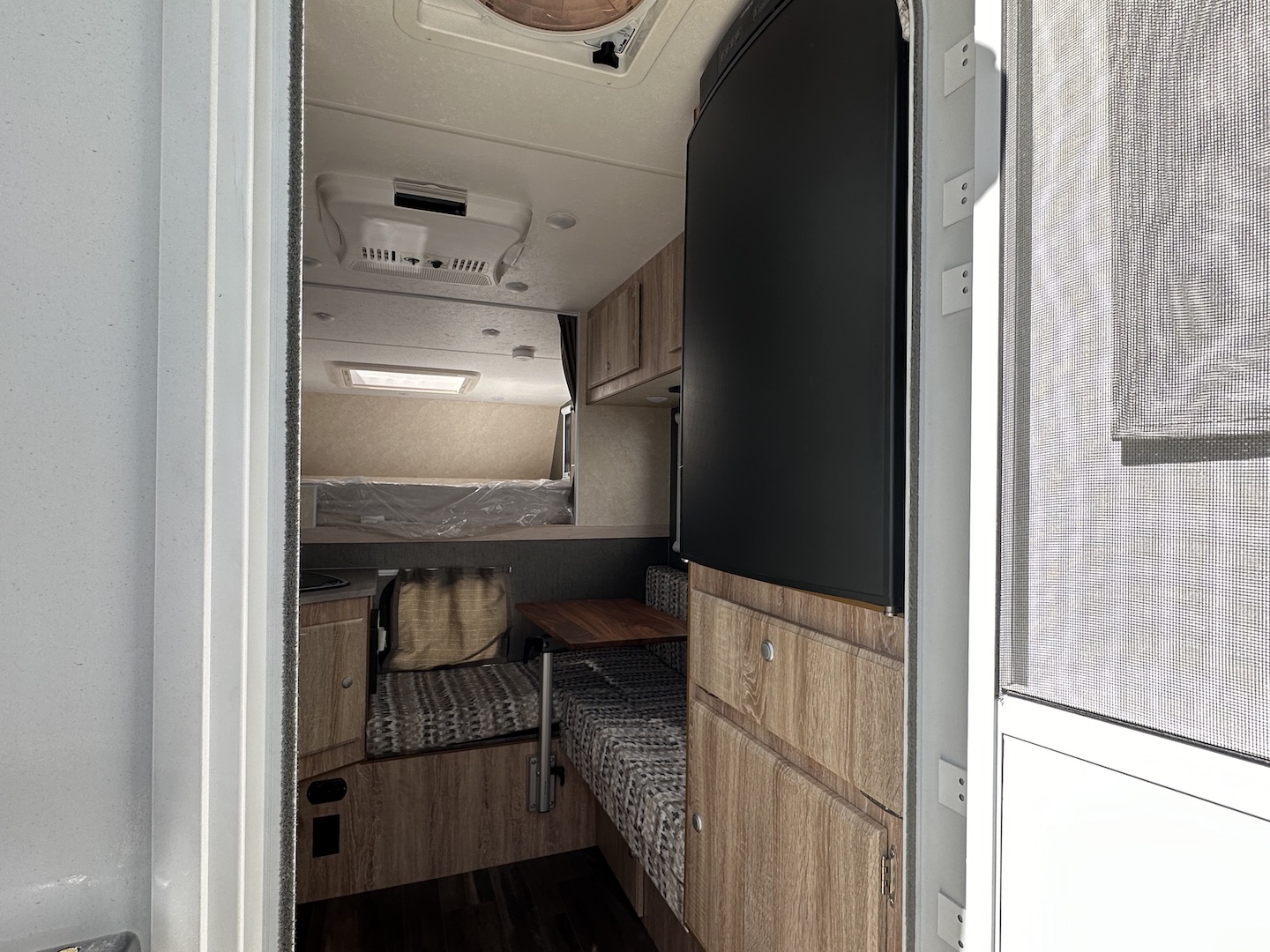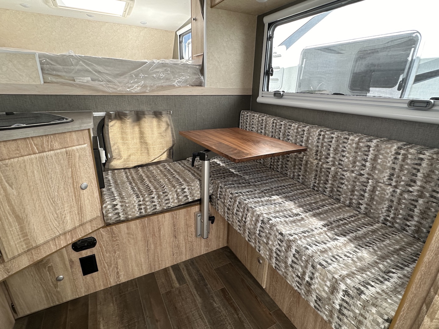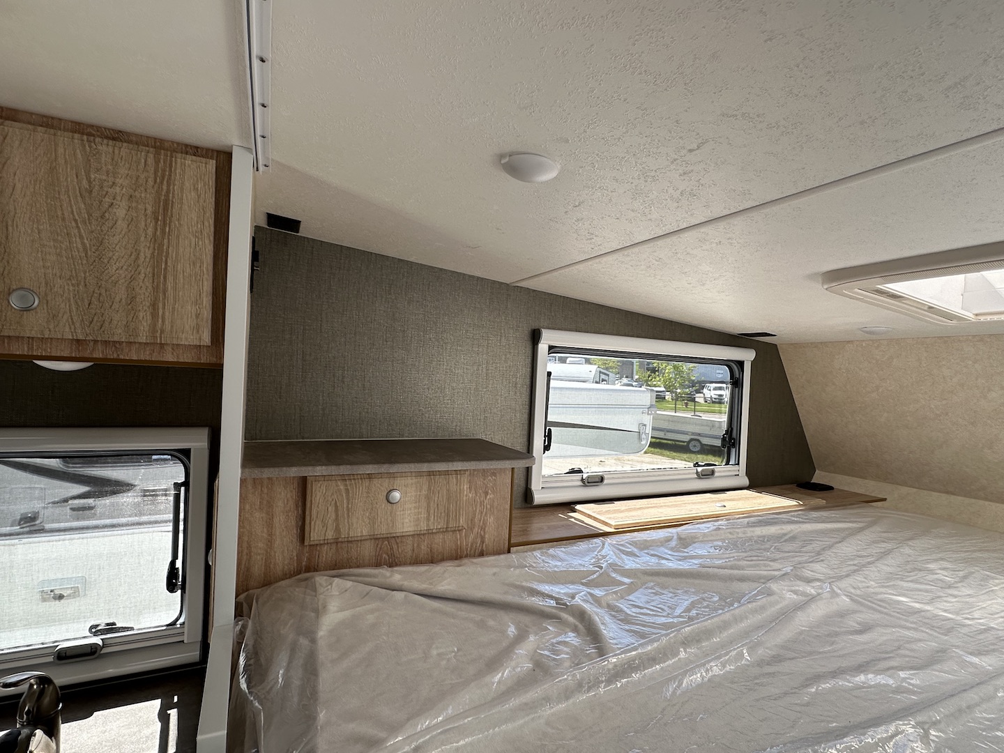 With a dry weight std. build of 1775 lbs. and floor length of 7′ this camper is designed to fit the ultra short beds (5′ 6″ to 5’ 10”) & Standard short beds (6′ 4″ to 6′ 10″) of 1/2 ton and larger full size trucks. Despite its compact size it still has many of the standard features of the larger Laredo SC & Wind Bandit, including extended cabover with a Queen sized 60” x 80” bed, insulated windows, auto ignition water heater, cassette toilet, interior/exterior shower and LED lighting to name but a few.