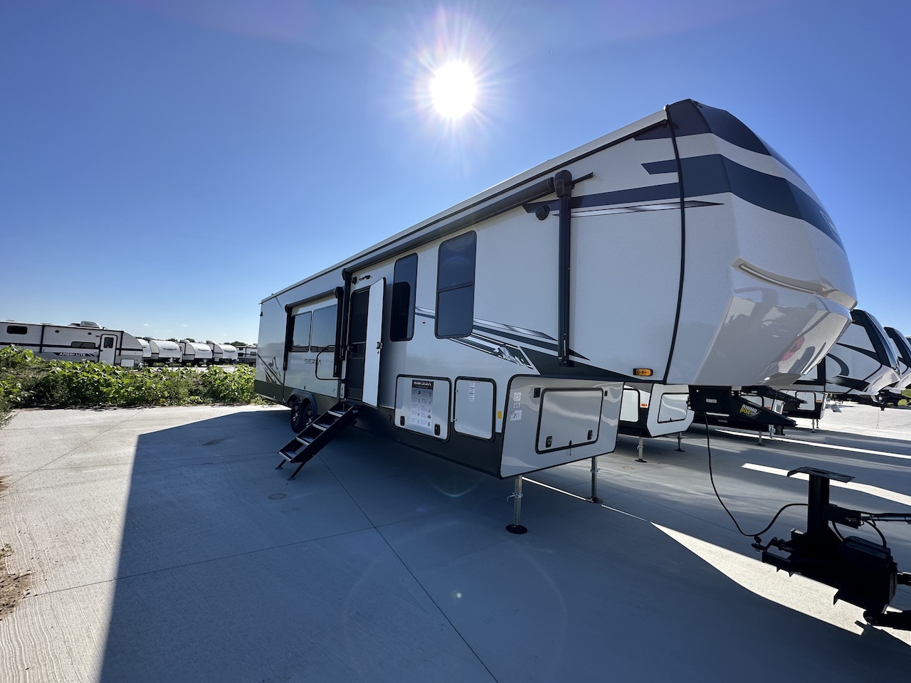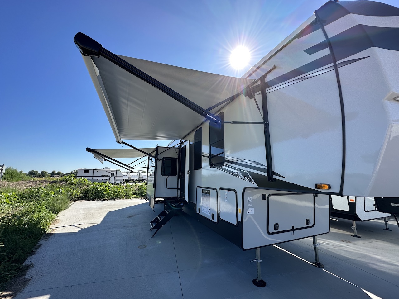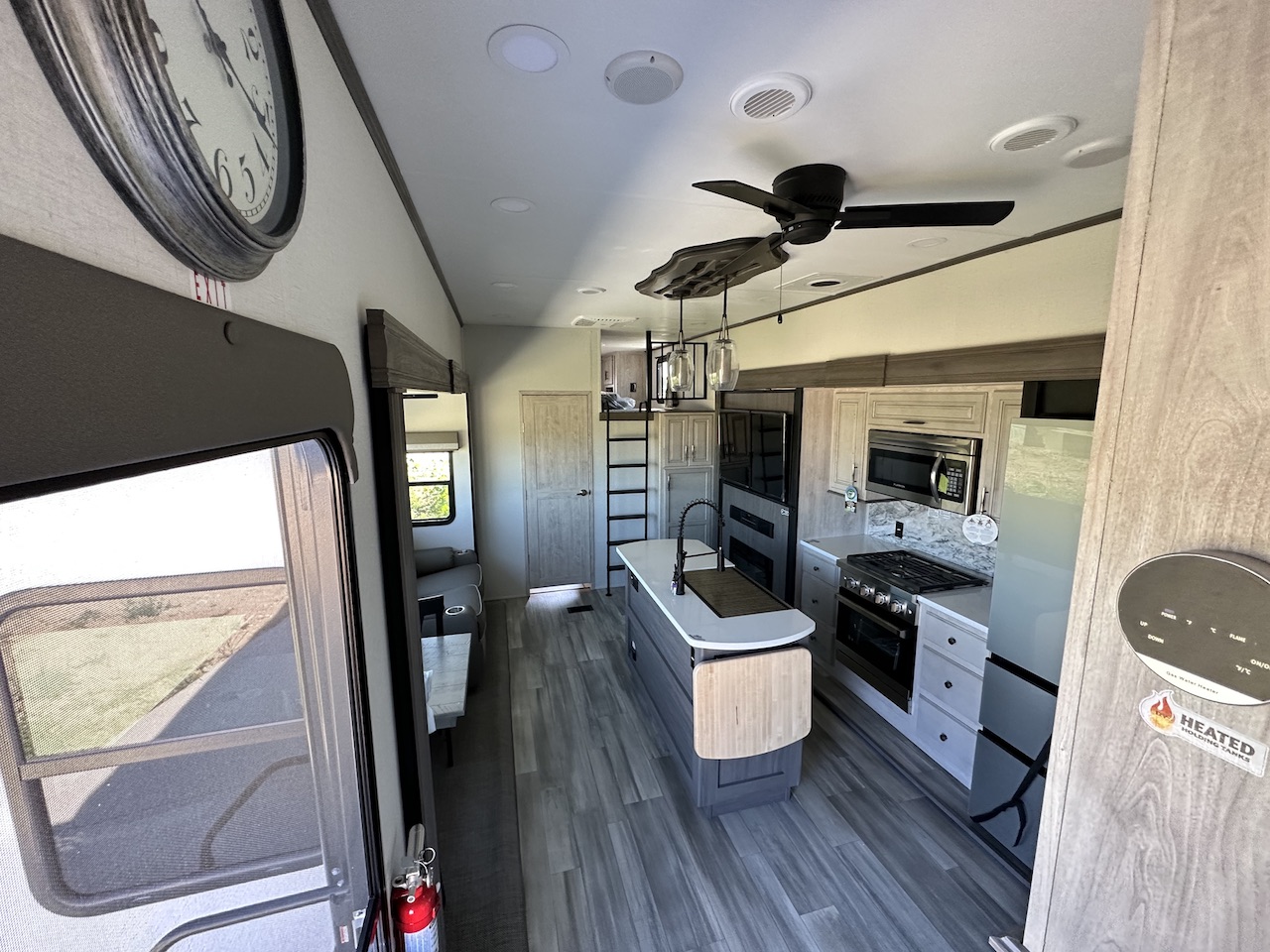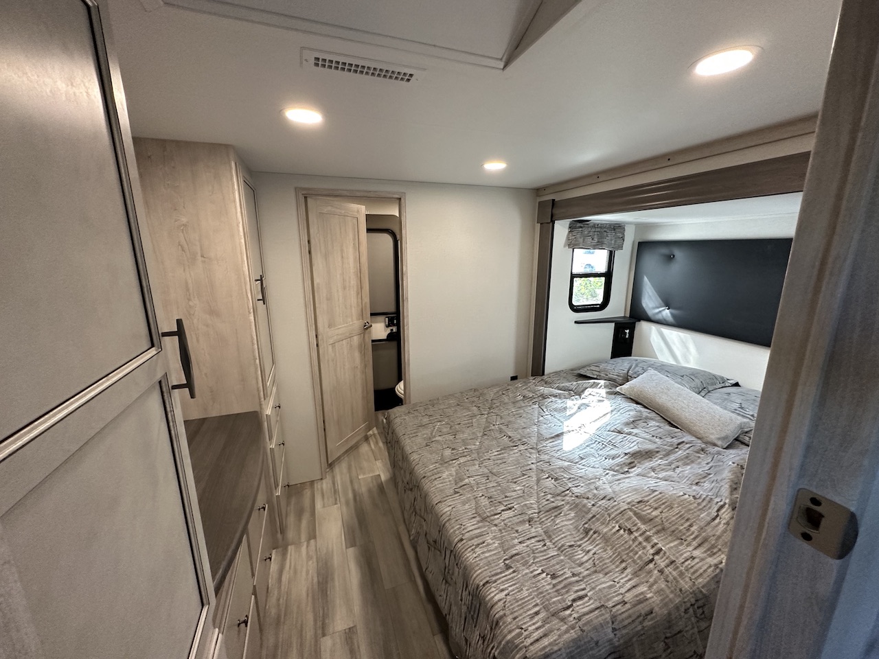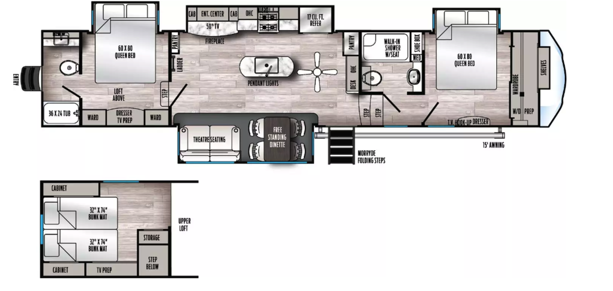 The 4002FB is a double queen bed and loft coach. With 4 slideouts and a double bunk loft, this floorplan has enough sleeping space for whoever wants to tag along. Rear entry into the 2nd full bath will offer full amenities without cluttering or using the master bath. The island kitchen and theater seating provide a great space to entertain and unwind. The 4002FB is extremely versatile, utilizing the extra bedroom or loft for storage when the sleeping space isn’t needed.