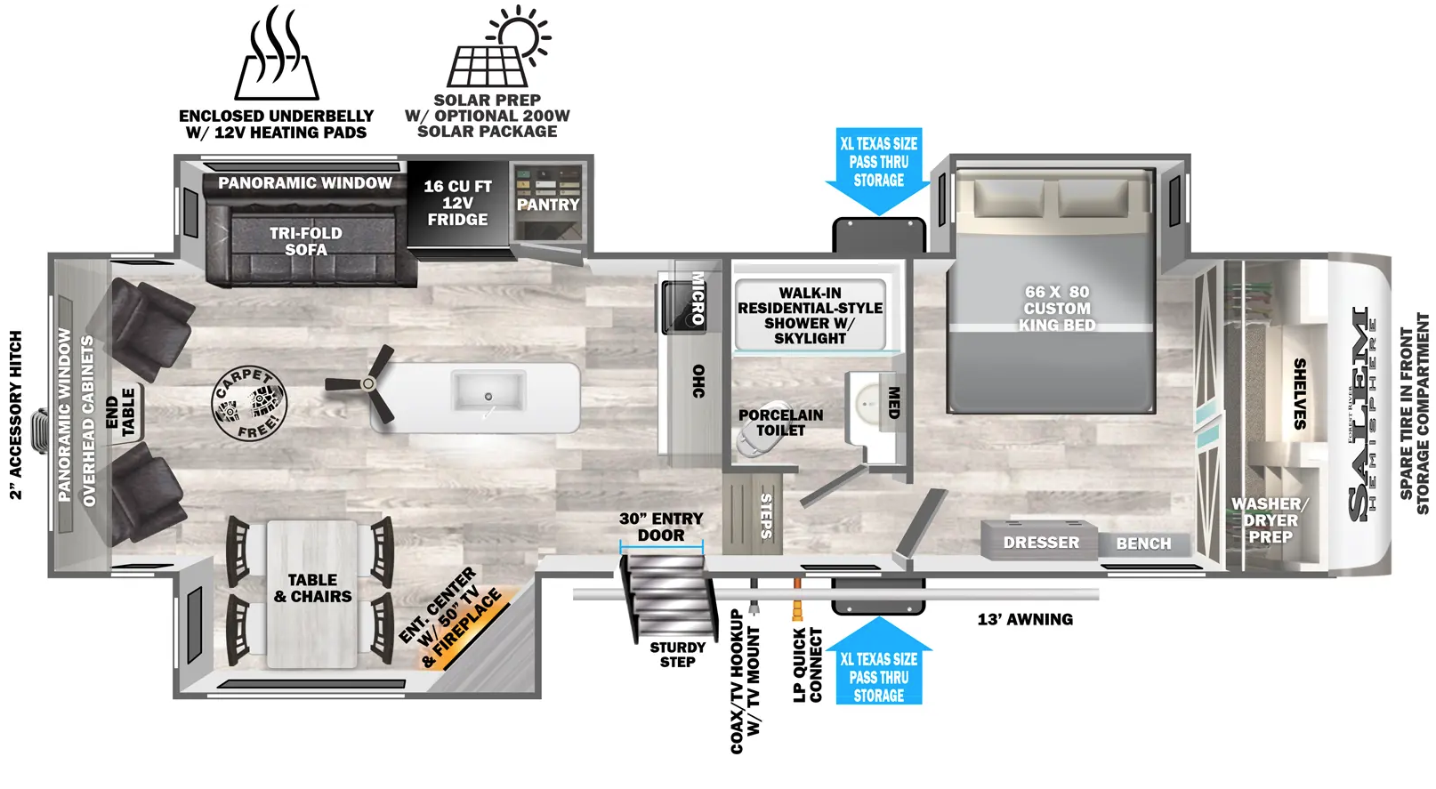 - Extra Large Pass Thru Storage with Slam Latch Baggage Doors