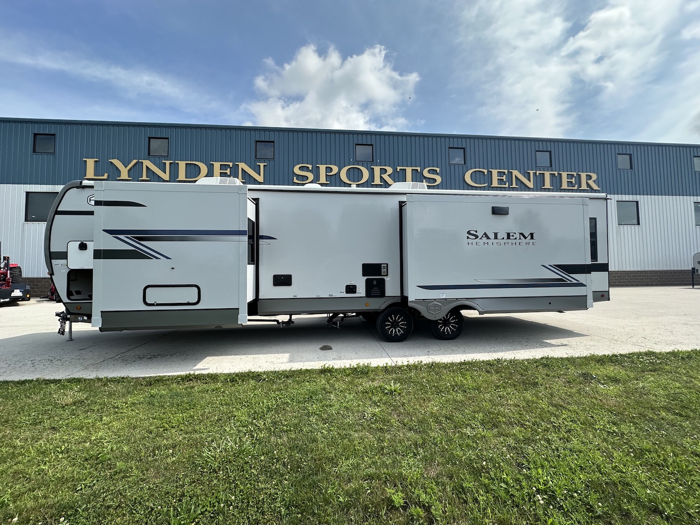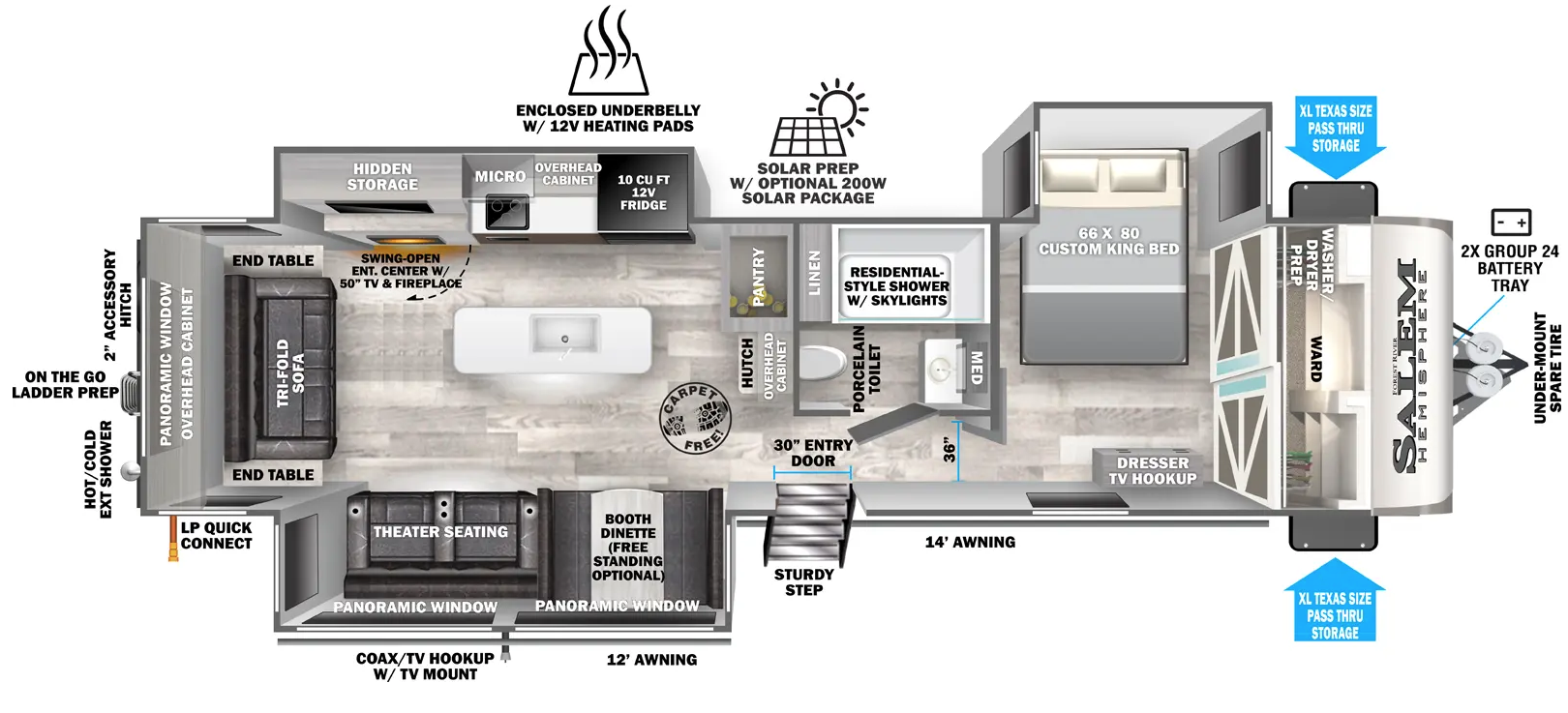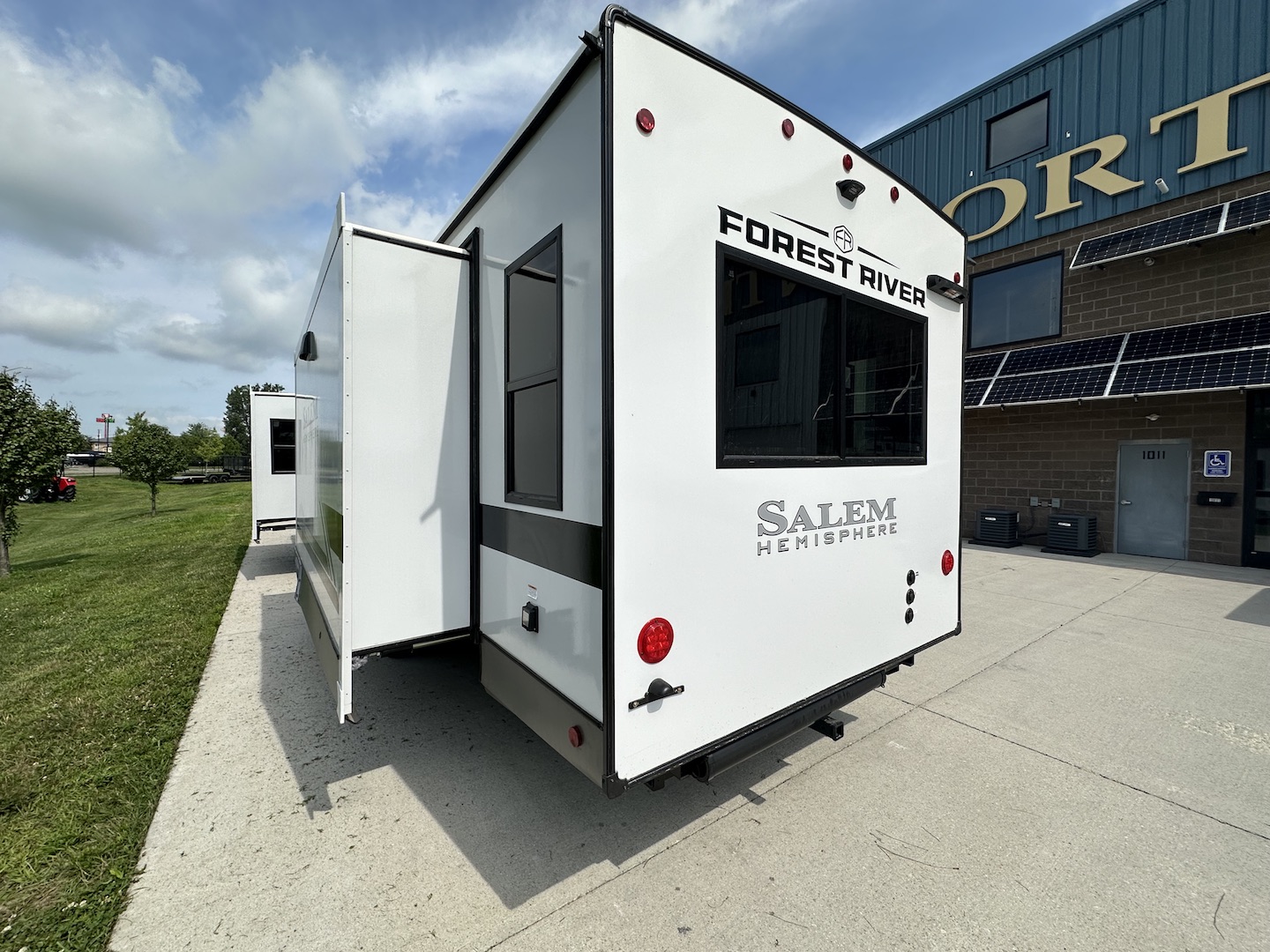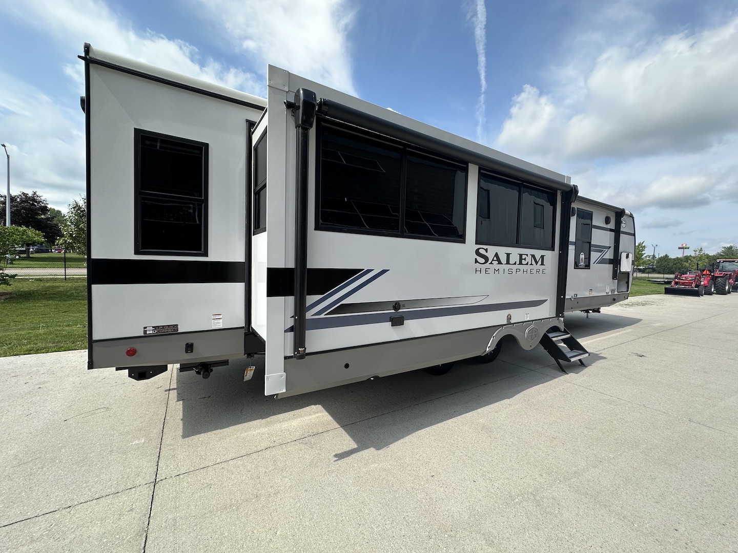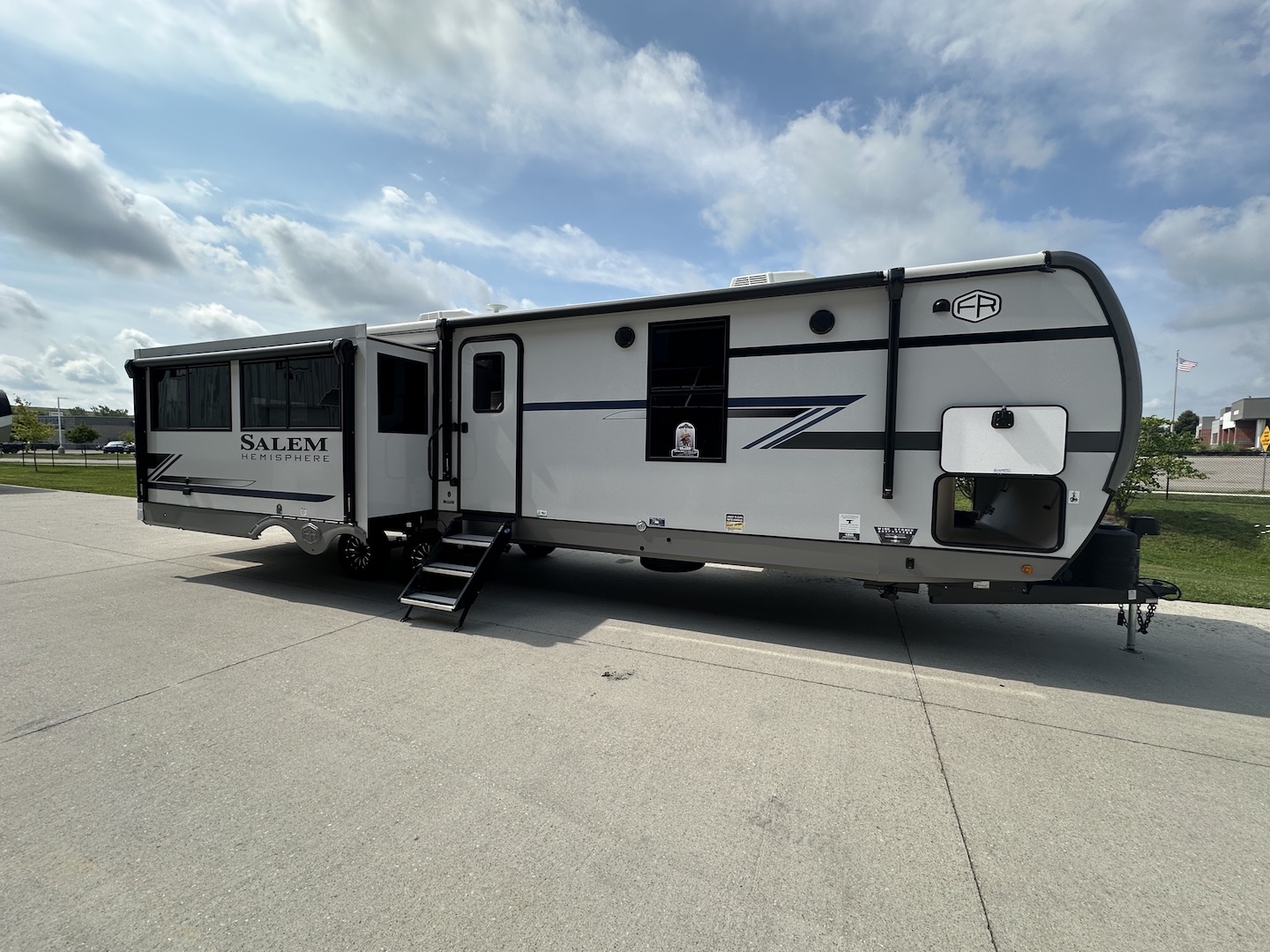 Touting 3 slide-outs, the 308RL is the most spacious Hemisphere Travel Trailer for coupes. Enjoy a breath-taking view of your campsite in the living room or relax in the wide-open bedroom. Past the bedroom you’ll find a WALK-IN wardrobe, and washer/dryer prep area spacious enough for separate washer & dryer. (This is the only model without a windshield, because we didn’t think your laundry would care to see outside).