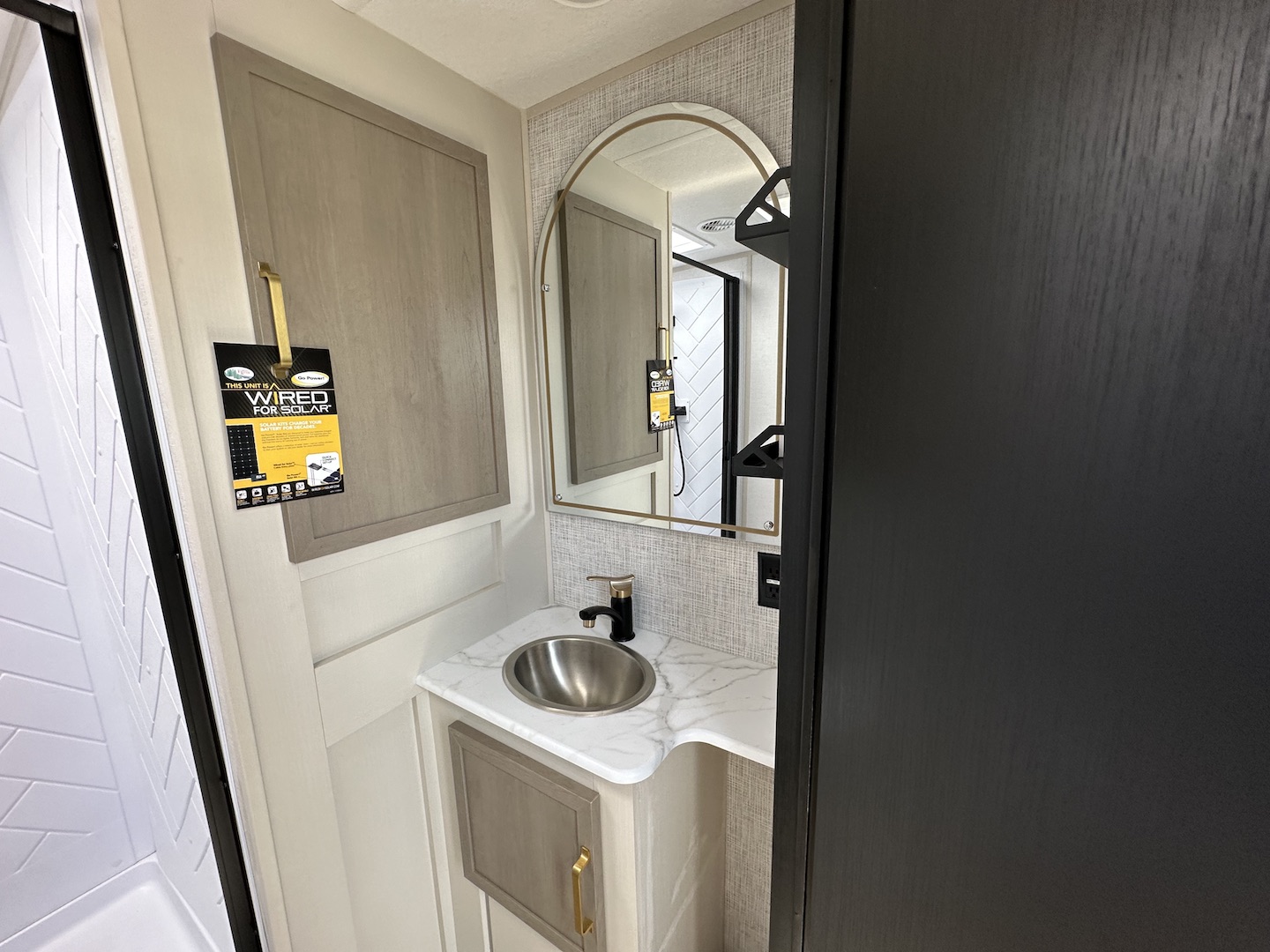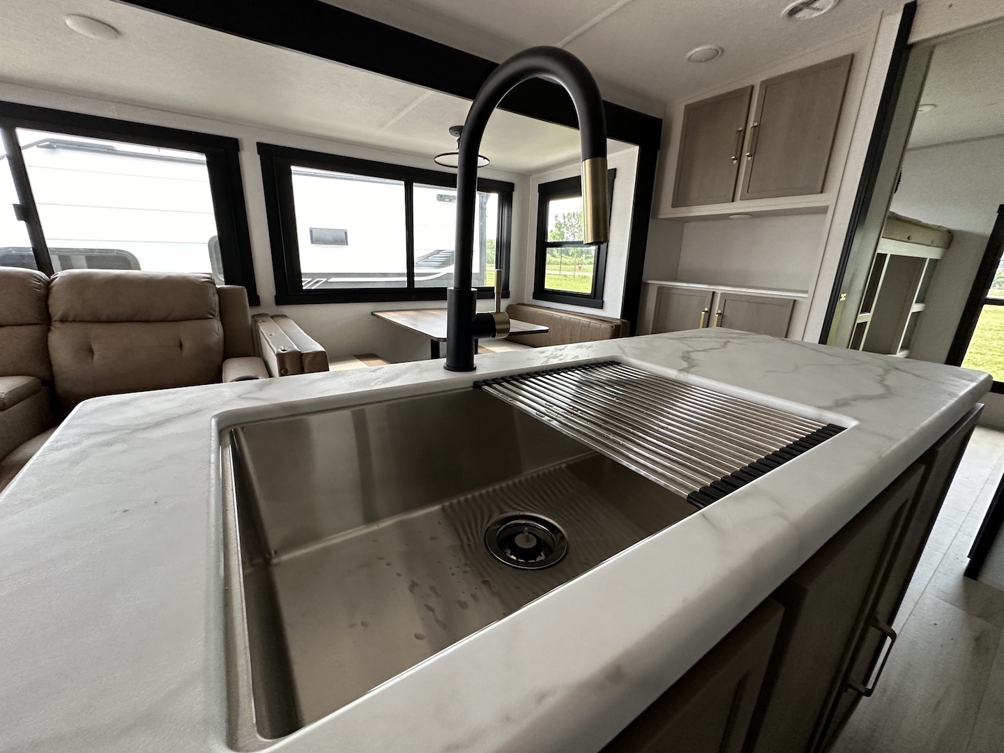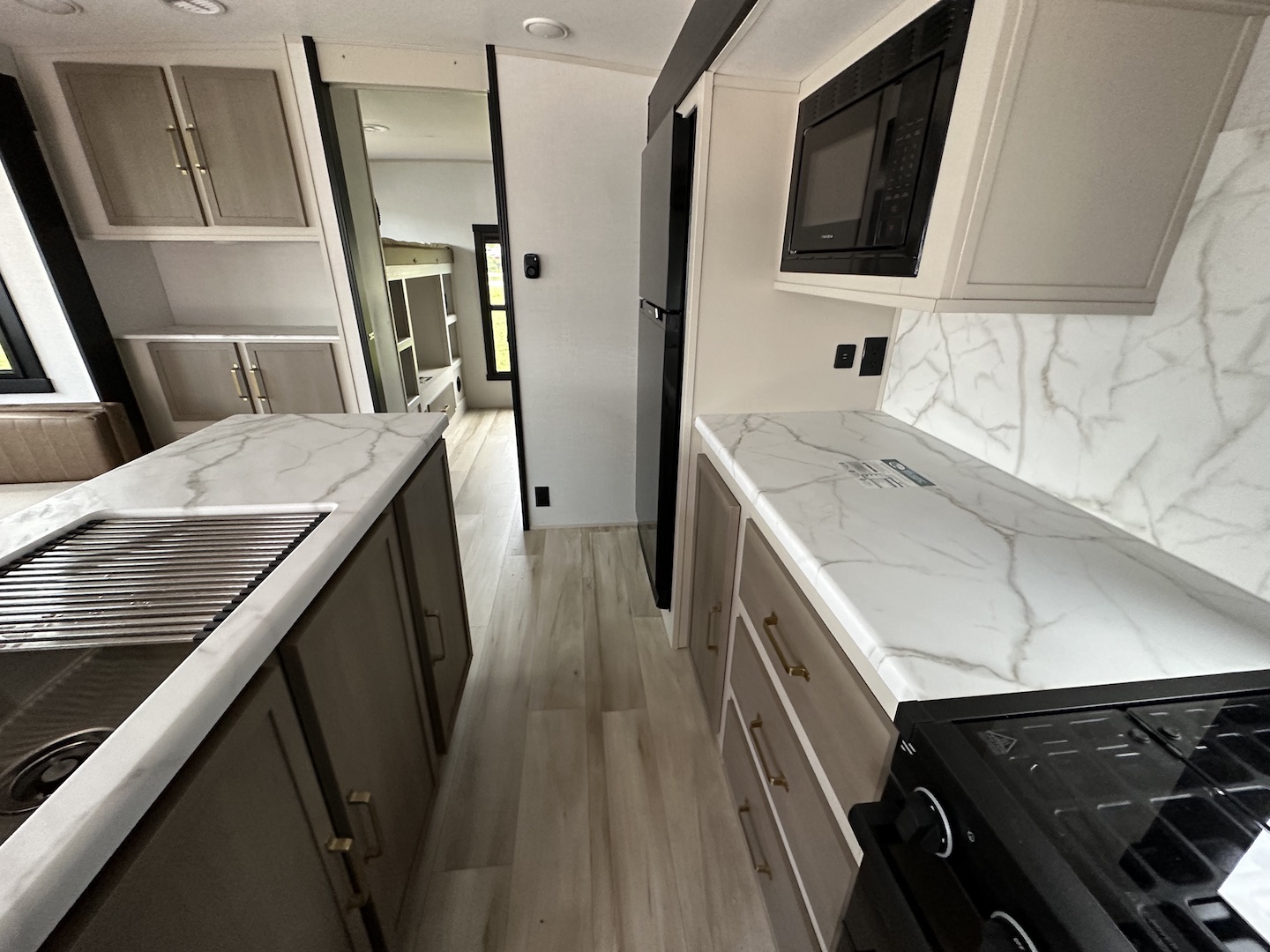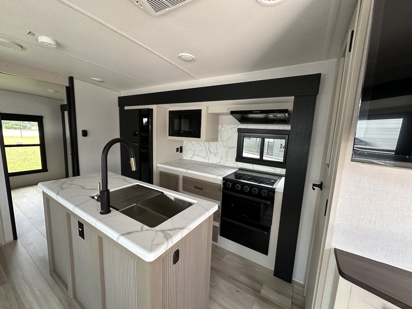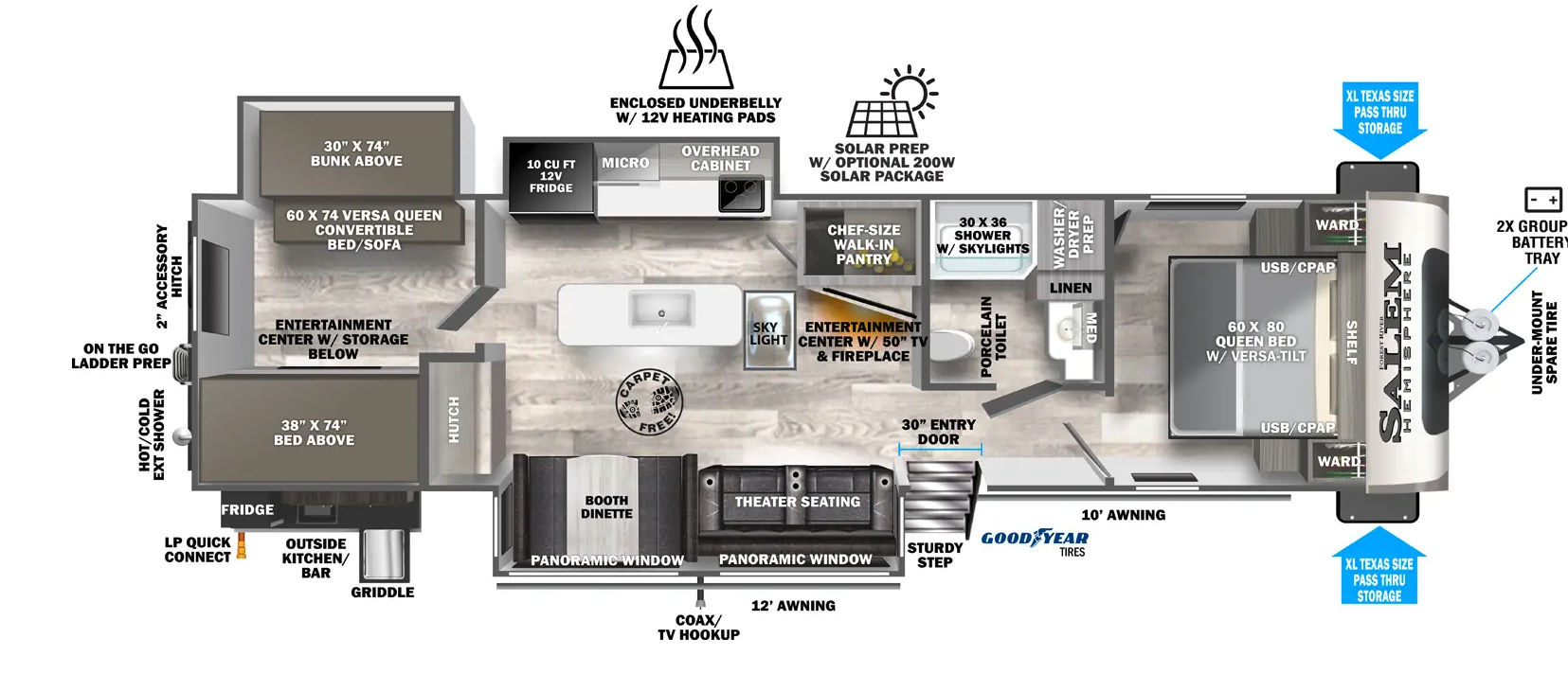 Camping with your family shouldn’t require you to sacrifice your living space. With the 310BHI, you don’t have to. This floorplan offers a MASSIVE outside kitchen, direct viewing of your campsite, a standard 50″ TV, and a pantry most houses would dream of. If that wasn’t enough, the 310BHI comes standard with stackable washer/dryer prep thoughtfully located in the bedroom closet/wardrobe.