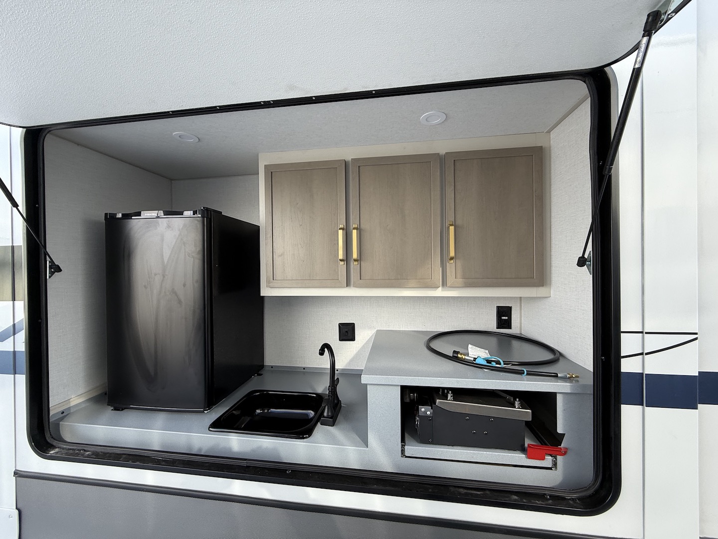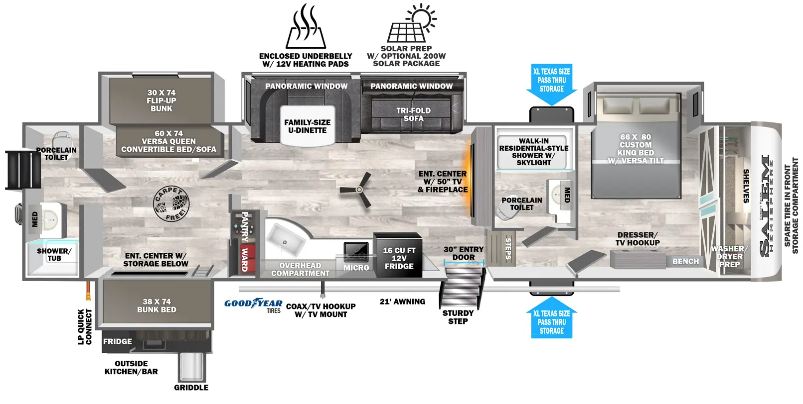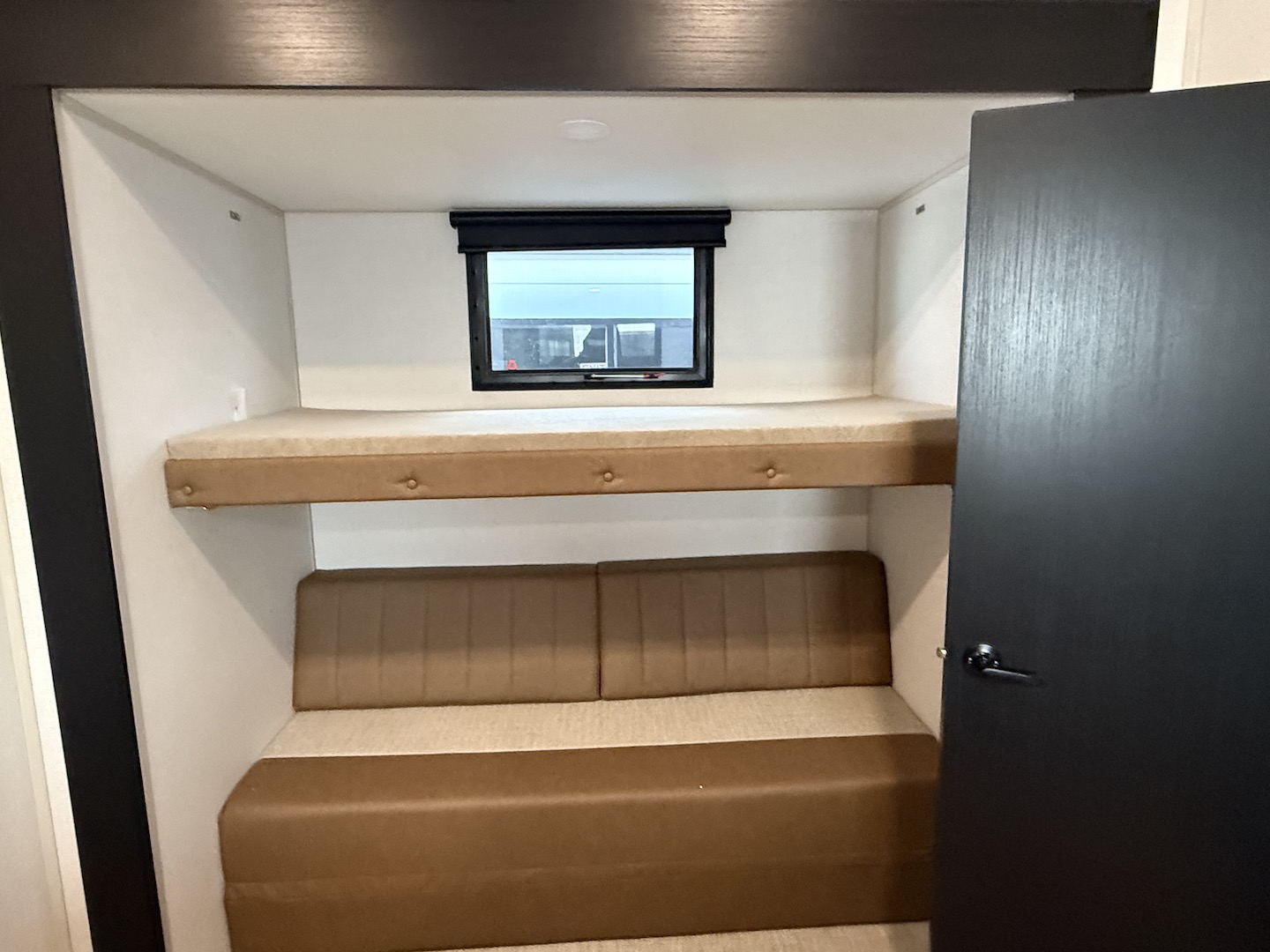 No… Camper… Left… Behind… Bring the whole gang with you in the 356QB. The biggest bunkhouse in the Hemisphere lineup, this floorplan sports 2 FULL BATHROOMS! Guests can use your 2nd bathroom through the rear entrance. A well-appointed outside kitchen rounds out this unbelievable floorplan.