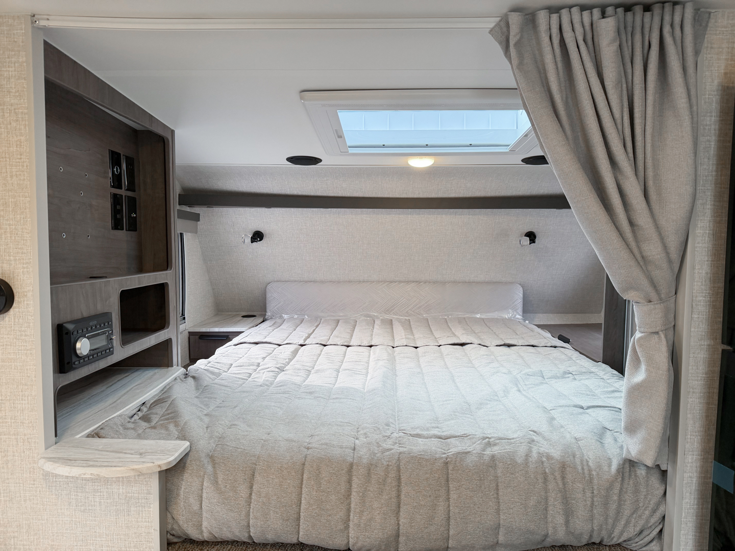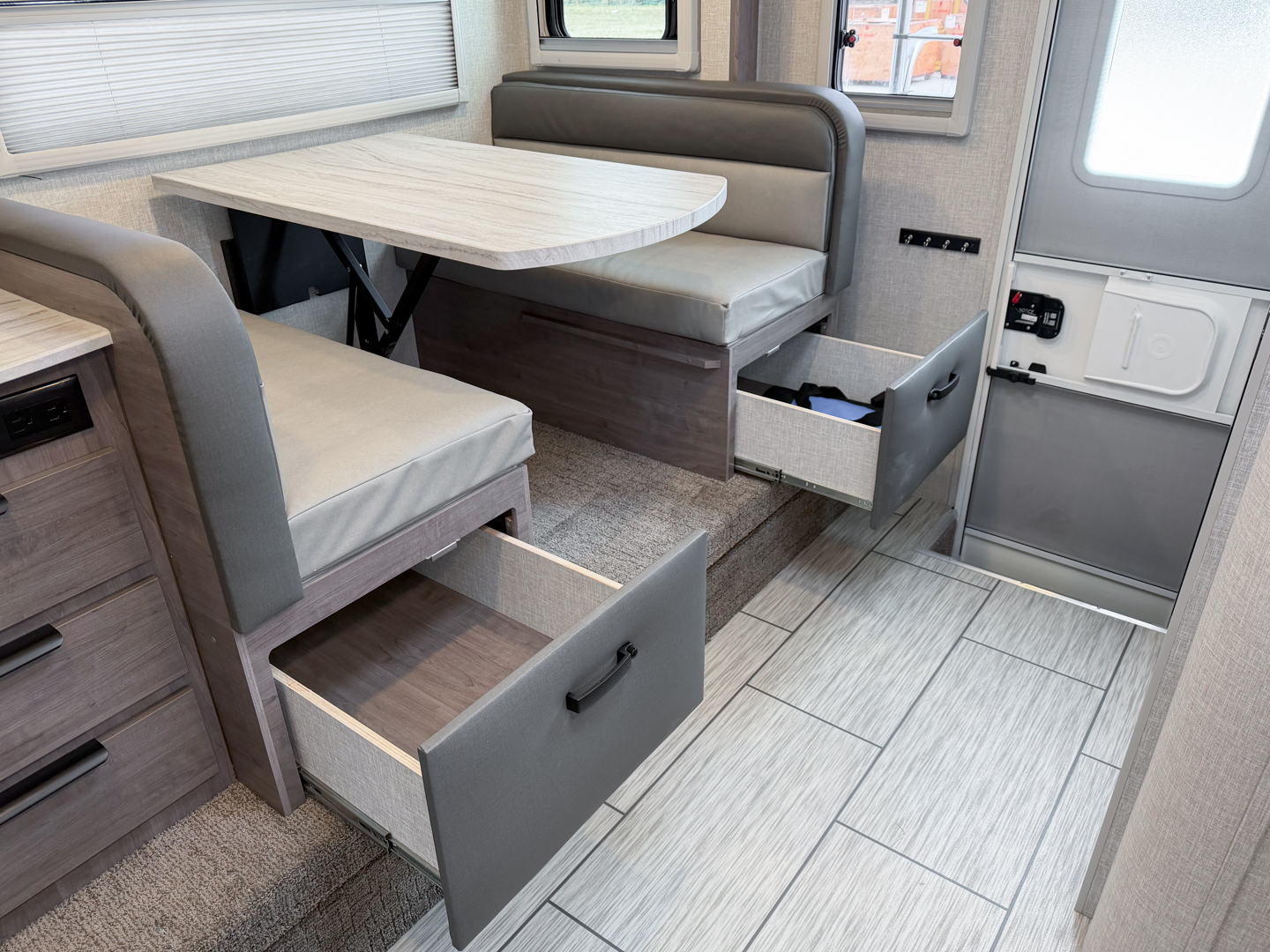 With over fifty-two inches (4′-4″) of main floor width, you have more than enough space for daily tasks and activities. No more waiting on your companion to get dressed before you can lace up your shoes! The raised floor also makes room for a sizeable slide out storage tray while reducing the height of the step up into both the dinette and cabover areas.