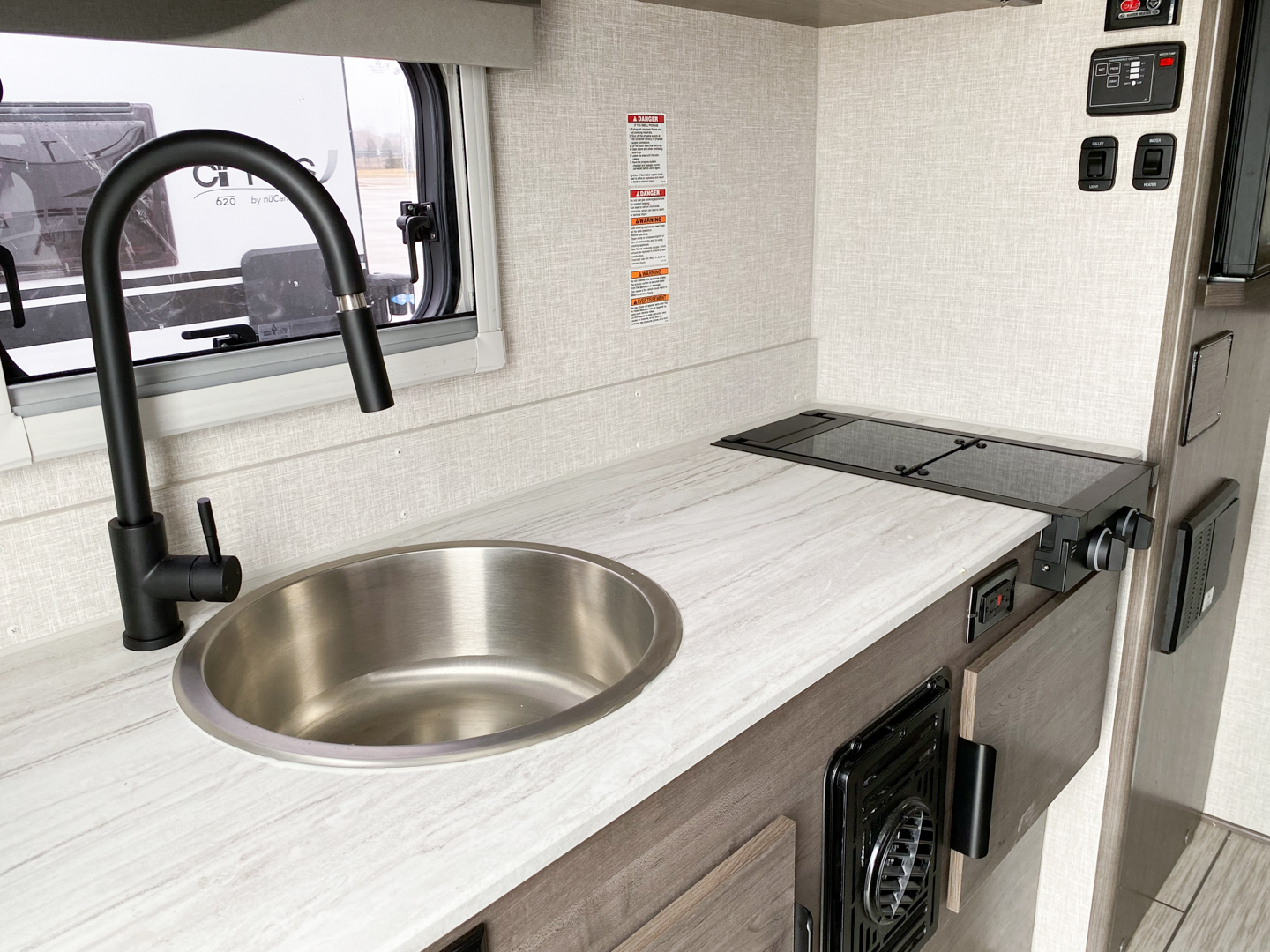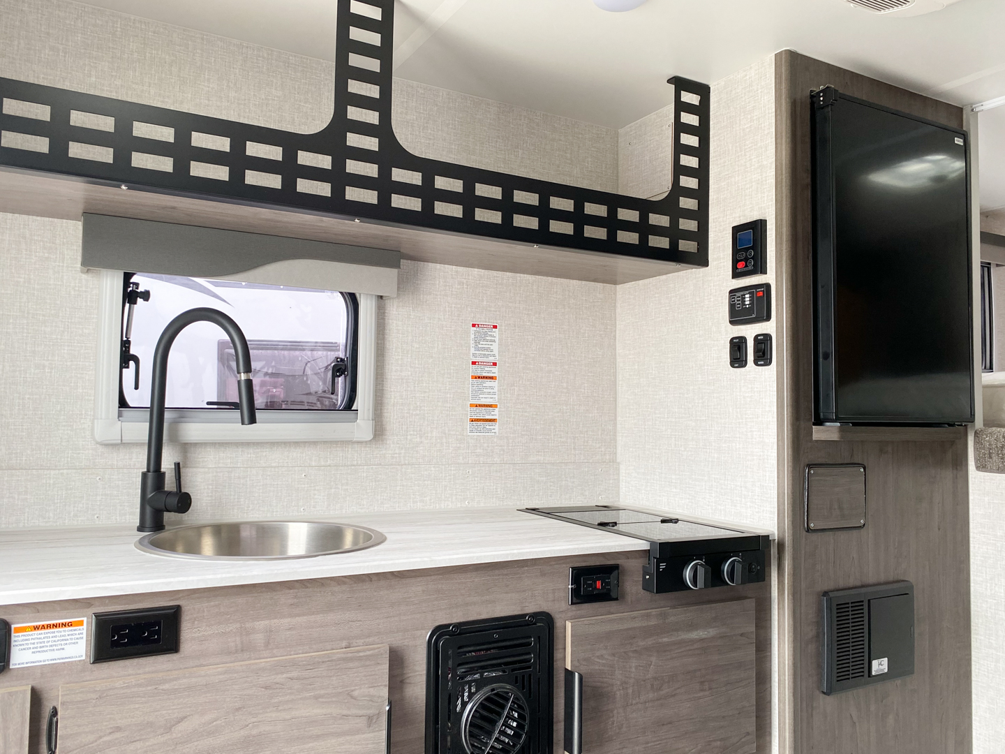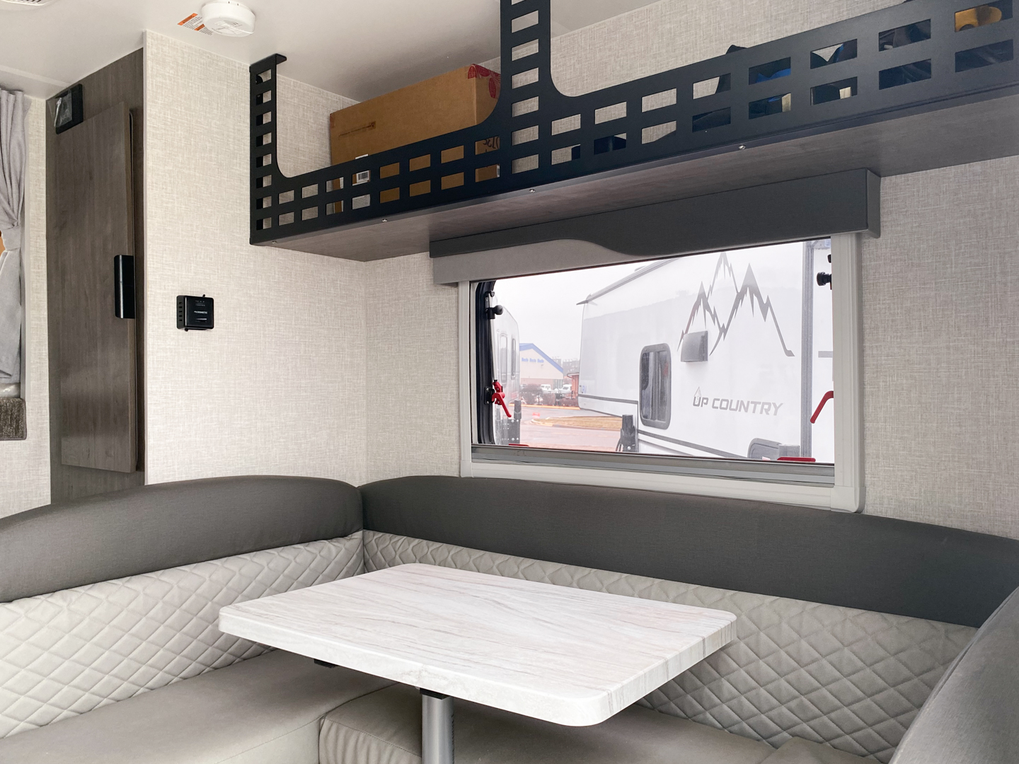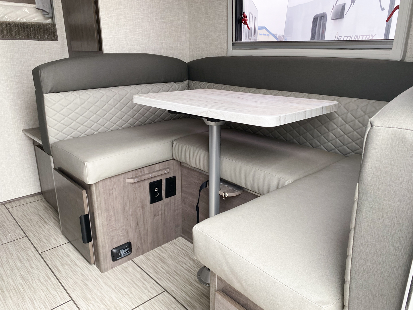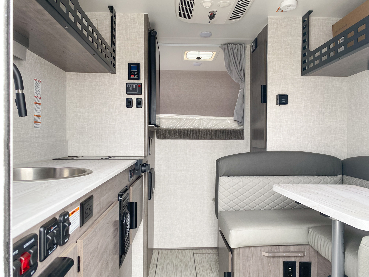 The goal we achieved with this model was to make a more minimalist space that still has all the necessities while staying super lightweight and with dimensions that allow owners of many different trucks and interests the ability to safely load up and hit the road. It boasts the longest countertop of any of our campers at 6′ with a built-in sink and a two-burner cooktop, two drawers and two under sink cabinets. Galley and storage space in any camper is at a premium and instead of building walls and fully faced cabinets and cramming in accents we focused on open space and large windows. Across from the massive countertop you find a large u-shaped dinette to match, above that you find on either side equal length MOLLE (Modular Lightweight Load-carrying Equipment) panels which serve as structure for the cabinet and also offers a huge grid to clip and fasten gear to which allows the owner big possibilities.