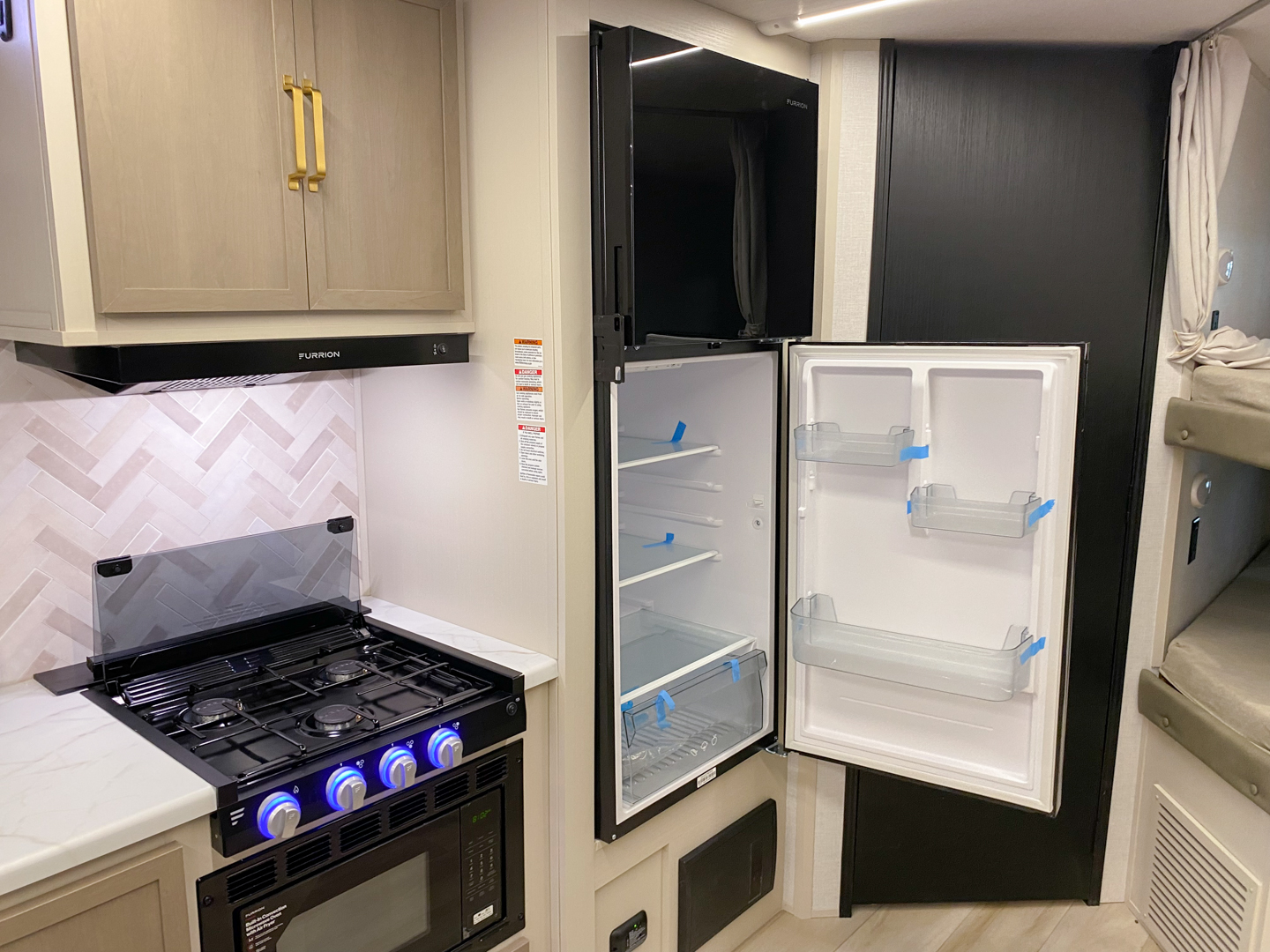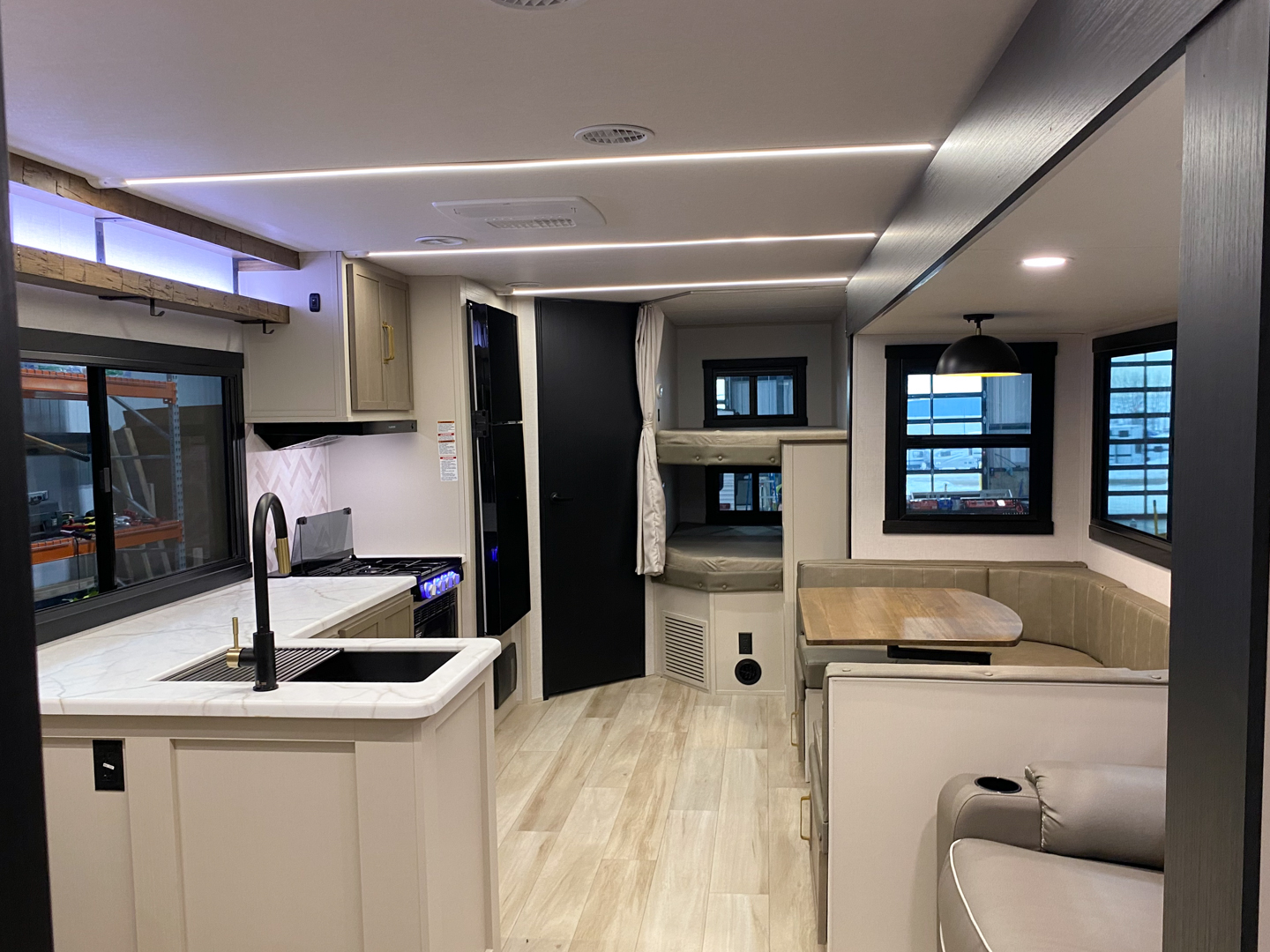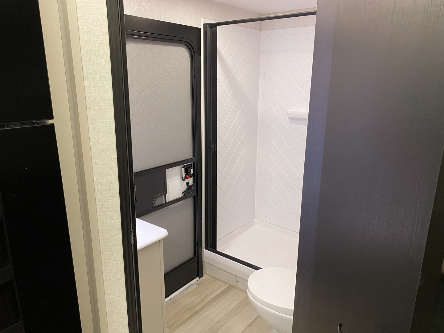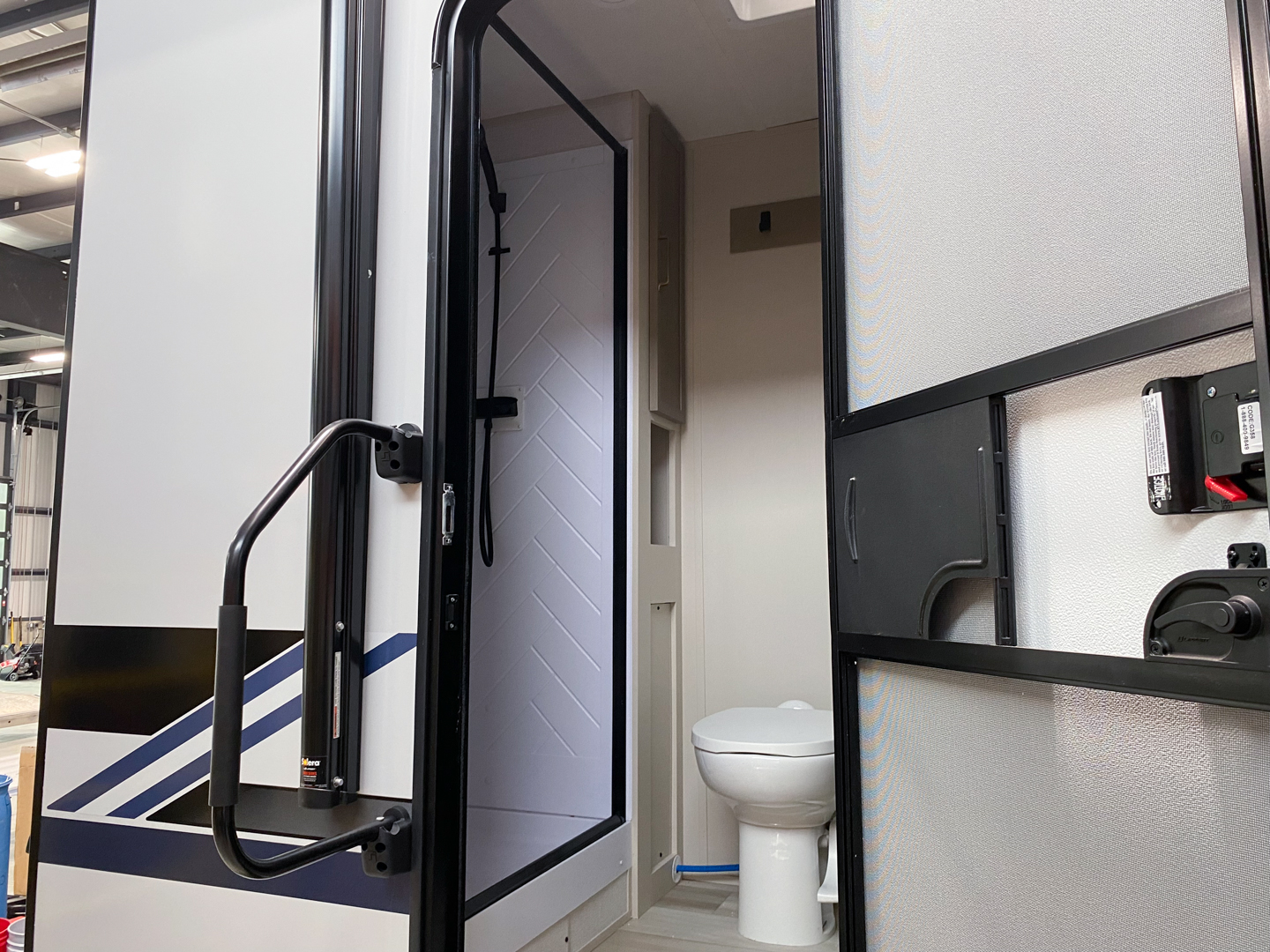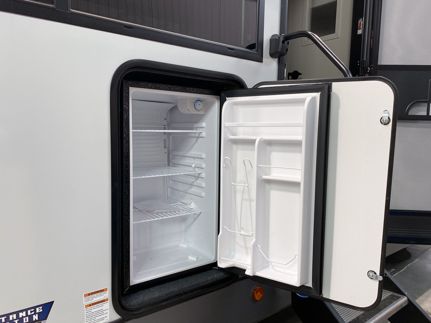 No corners were cut in the 25RBHL. The theater seat (facing the entertainment center) and full-sized dinette separate the best-in-class bathroom and bedroom. 36″ wide sliding barn doors offer complete privacy, or the ability to open the 25RBHL up from front to back. This camper also offers a refrigerator outside underneath the awning.