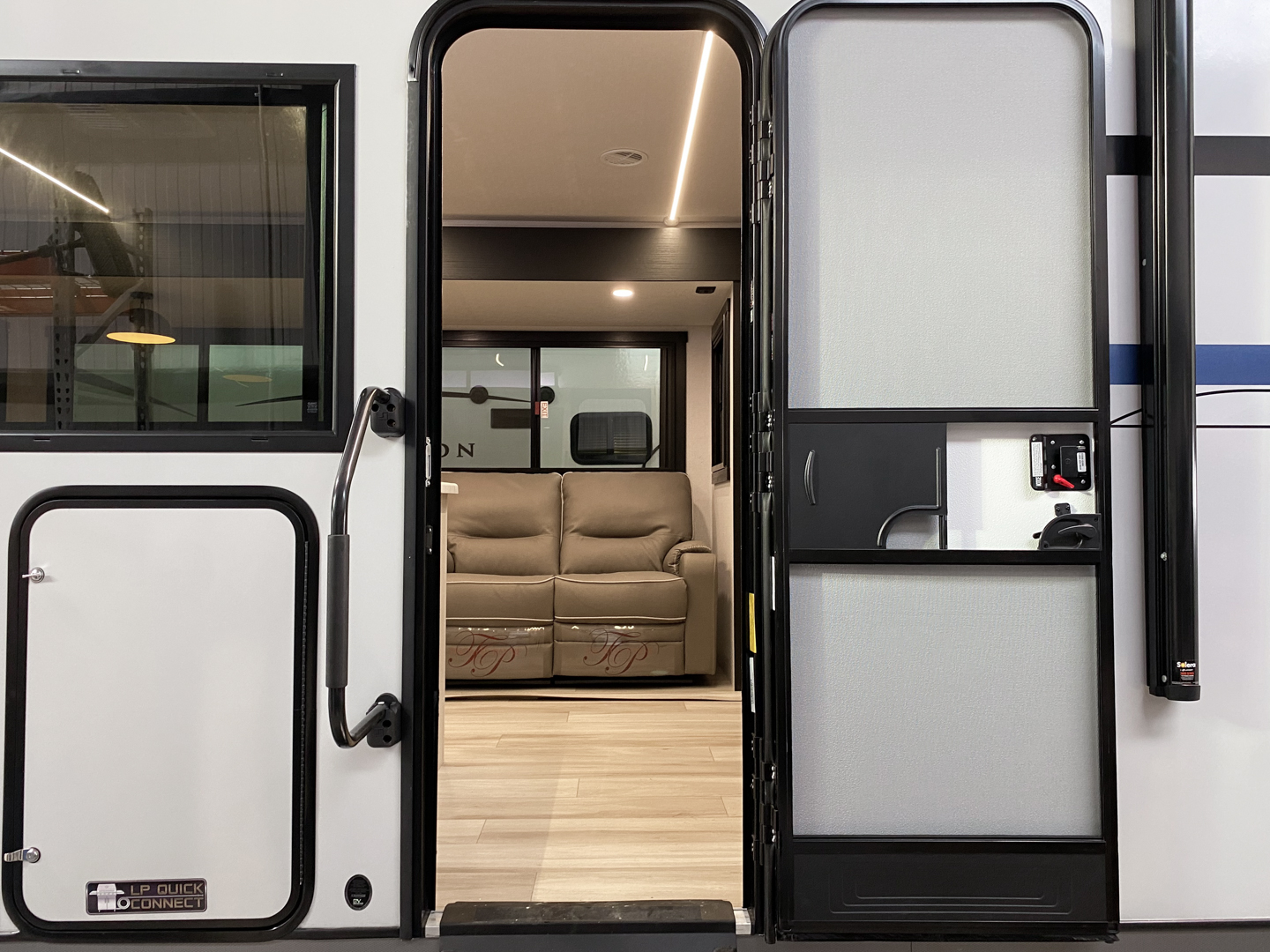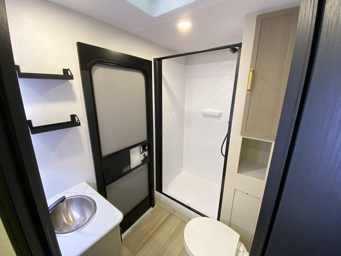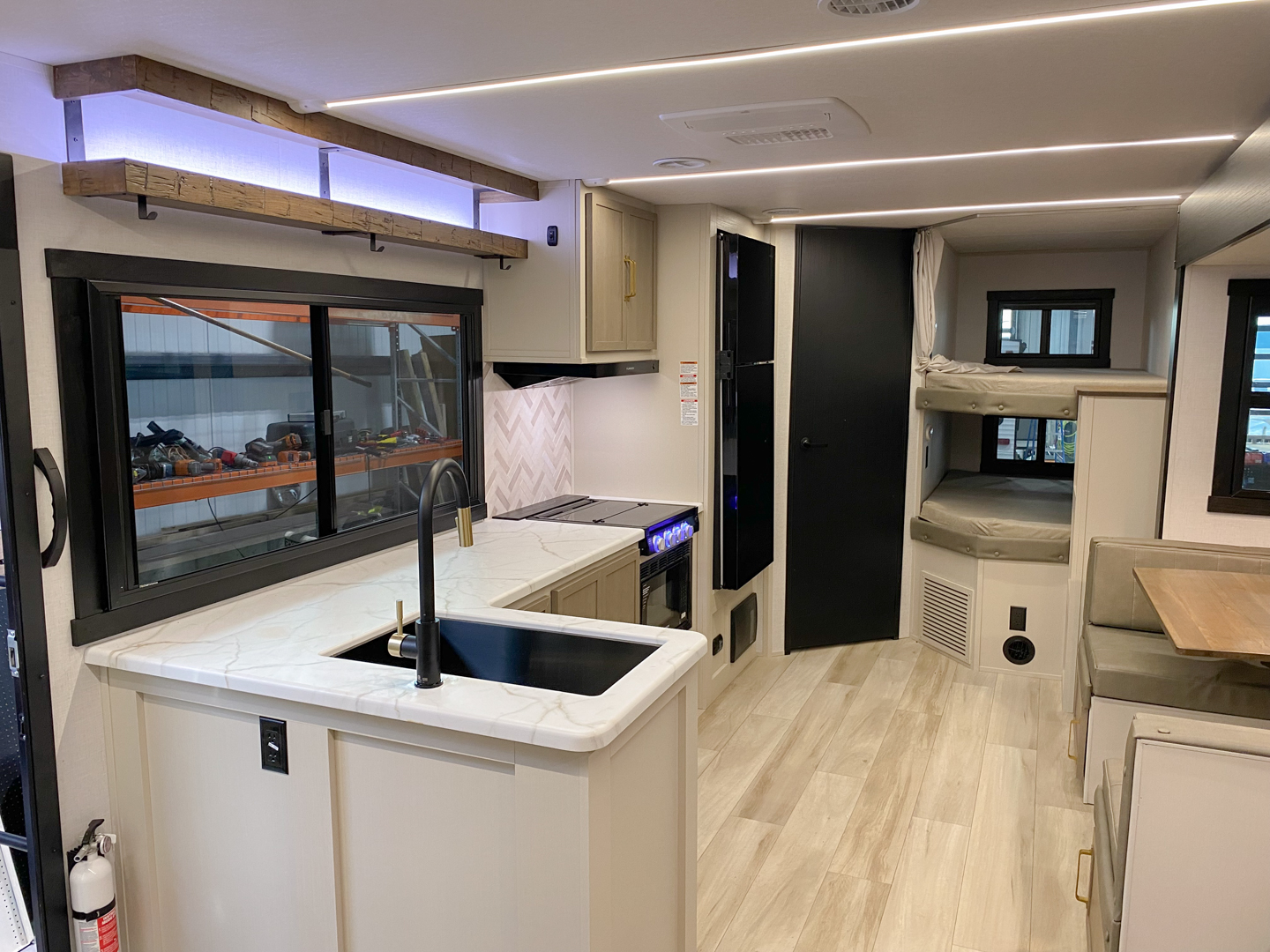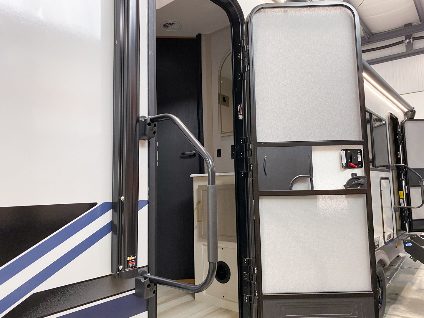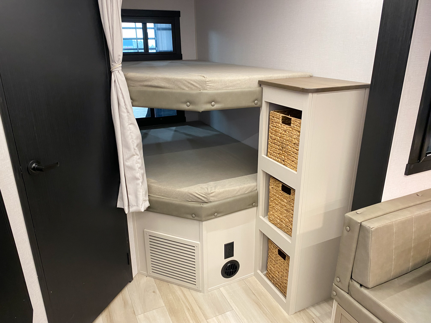 No corners were cut in the 25RBHL. The theater seat (facing the entertainment center) and full-sized dinette separate the best-in-class bathroom and bedroom. 36″ wide sliding barn doors offer complete privacy, or the ability to open the 25RBHL up from front to back. This camper also offers a refrigerator outside underneath the awning.