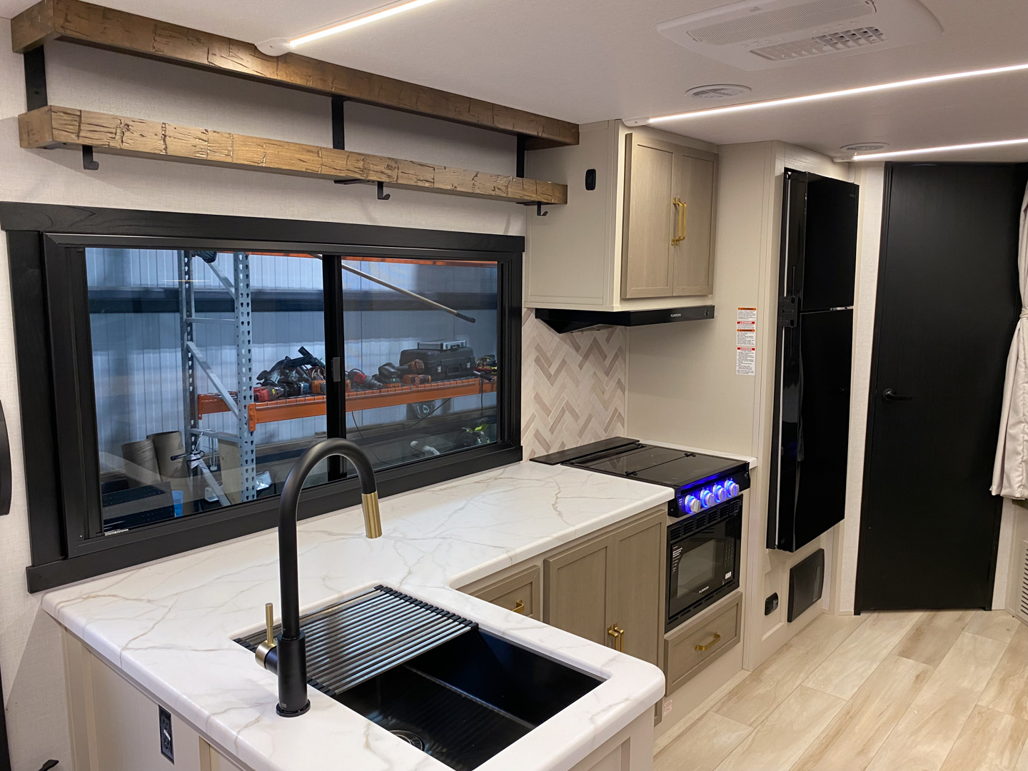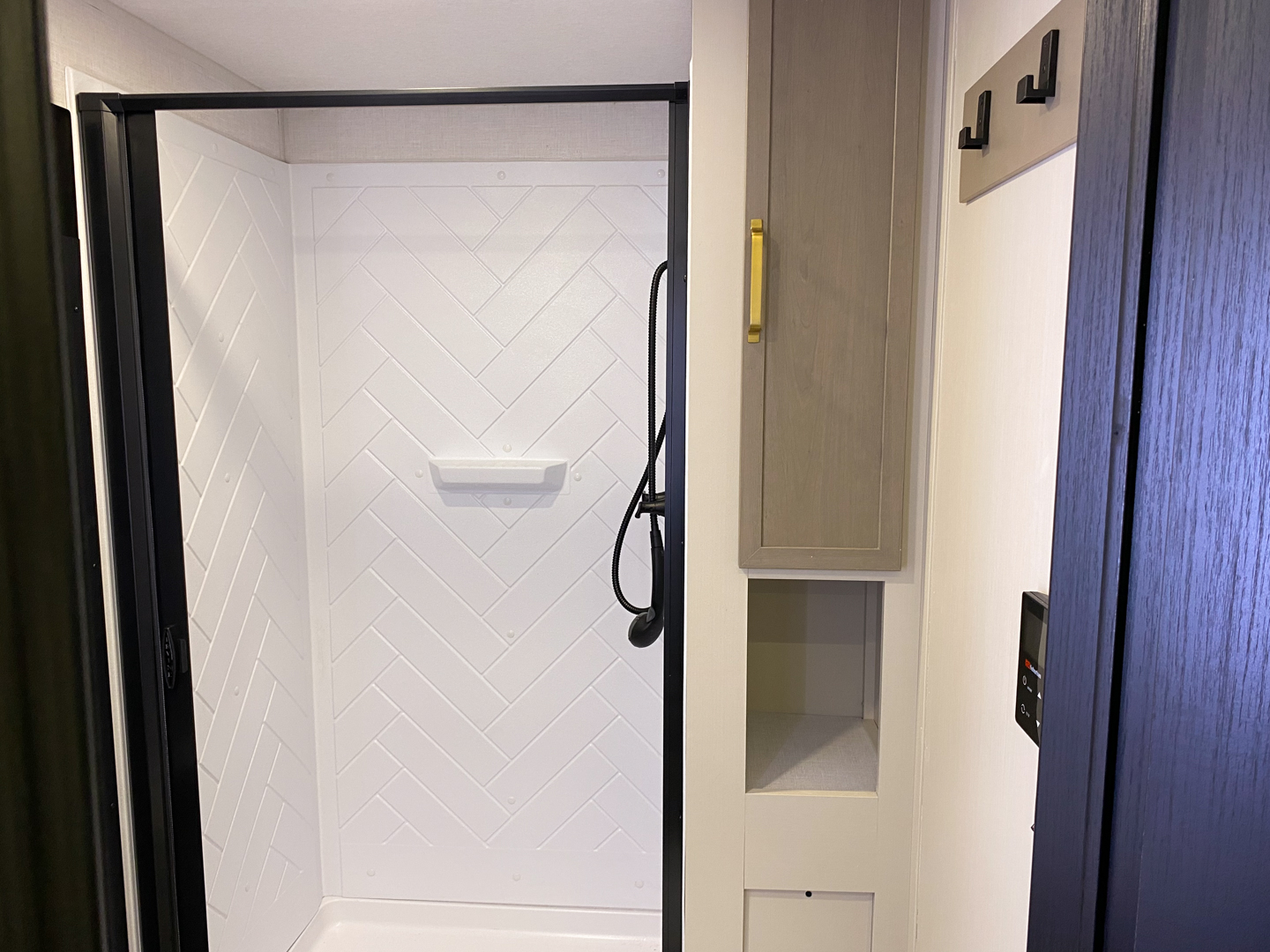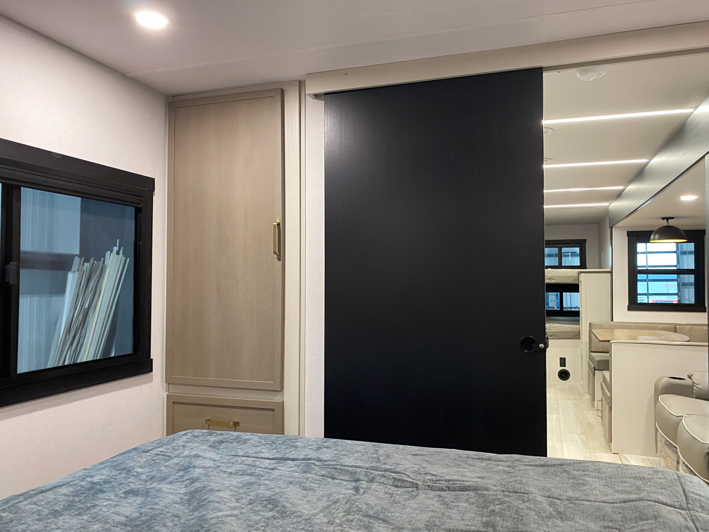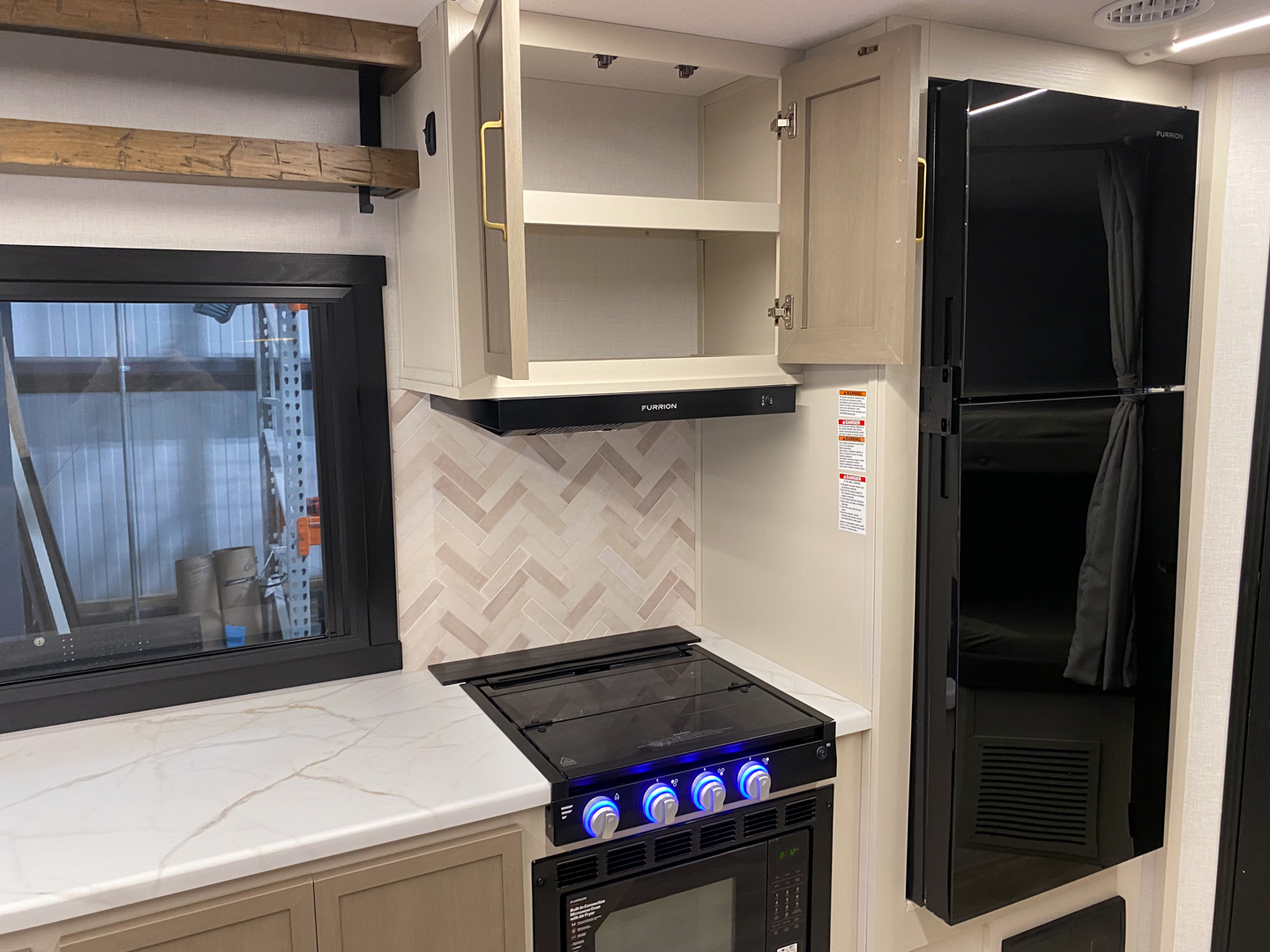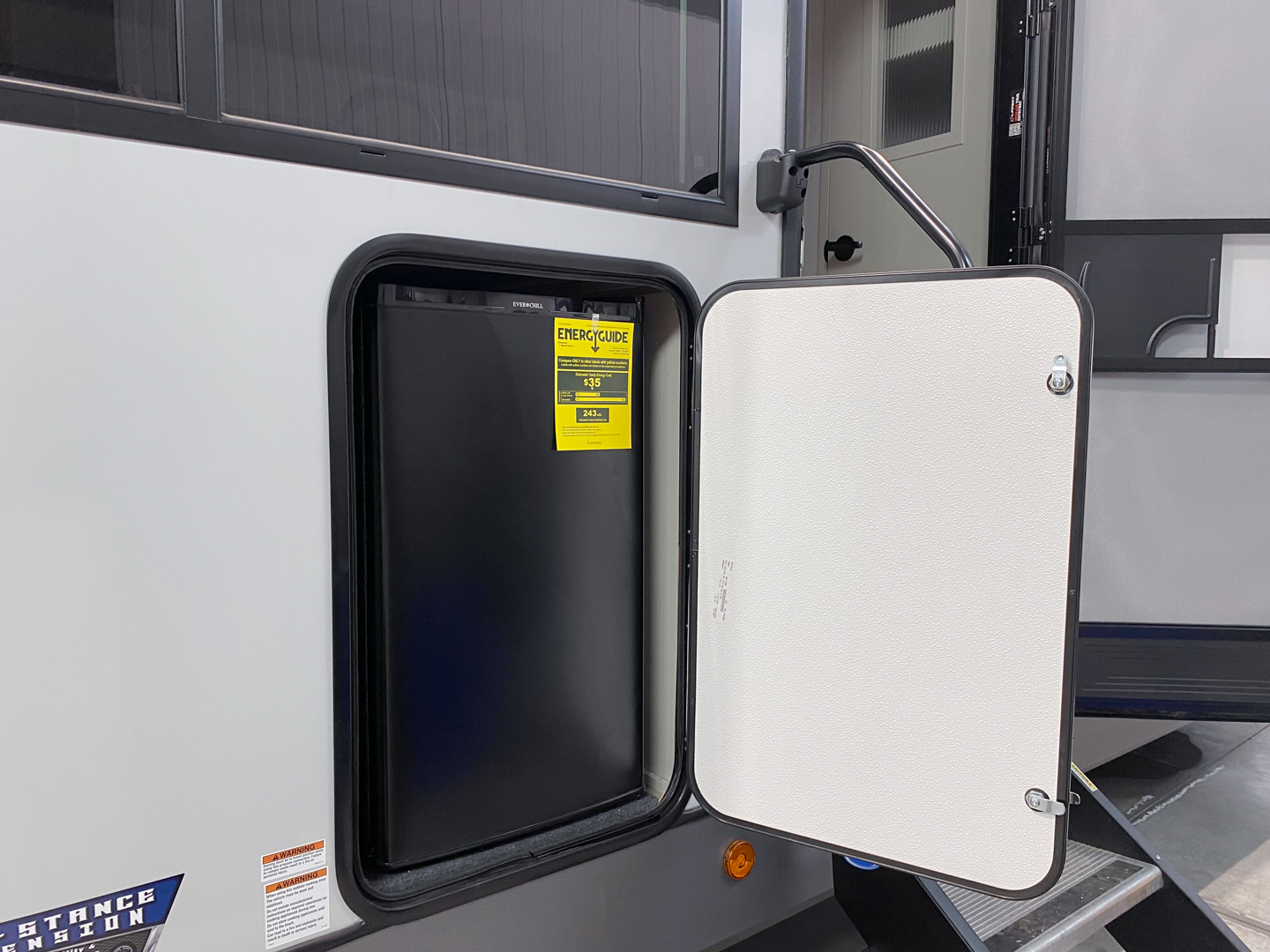 No corners were cut in the 25RBHL. The theater seat (facing the entertainment center) and full-sized dinette separate the best-in-class bathroom and bedroom. 36″ wide sliding barn doors offer complete privacy, or the ability to open the 25RBHL up from front to back. This camper also offers a refrigerator outside underneath the awning.