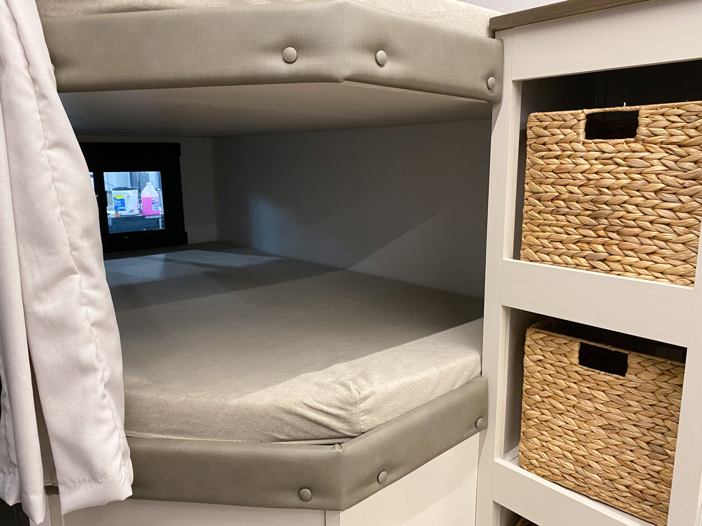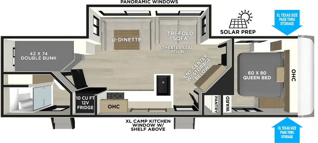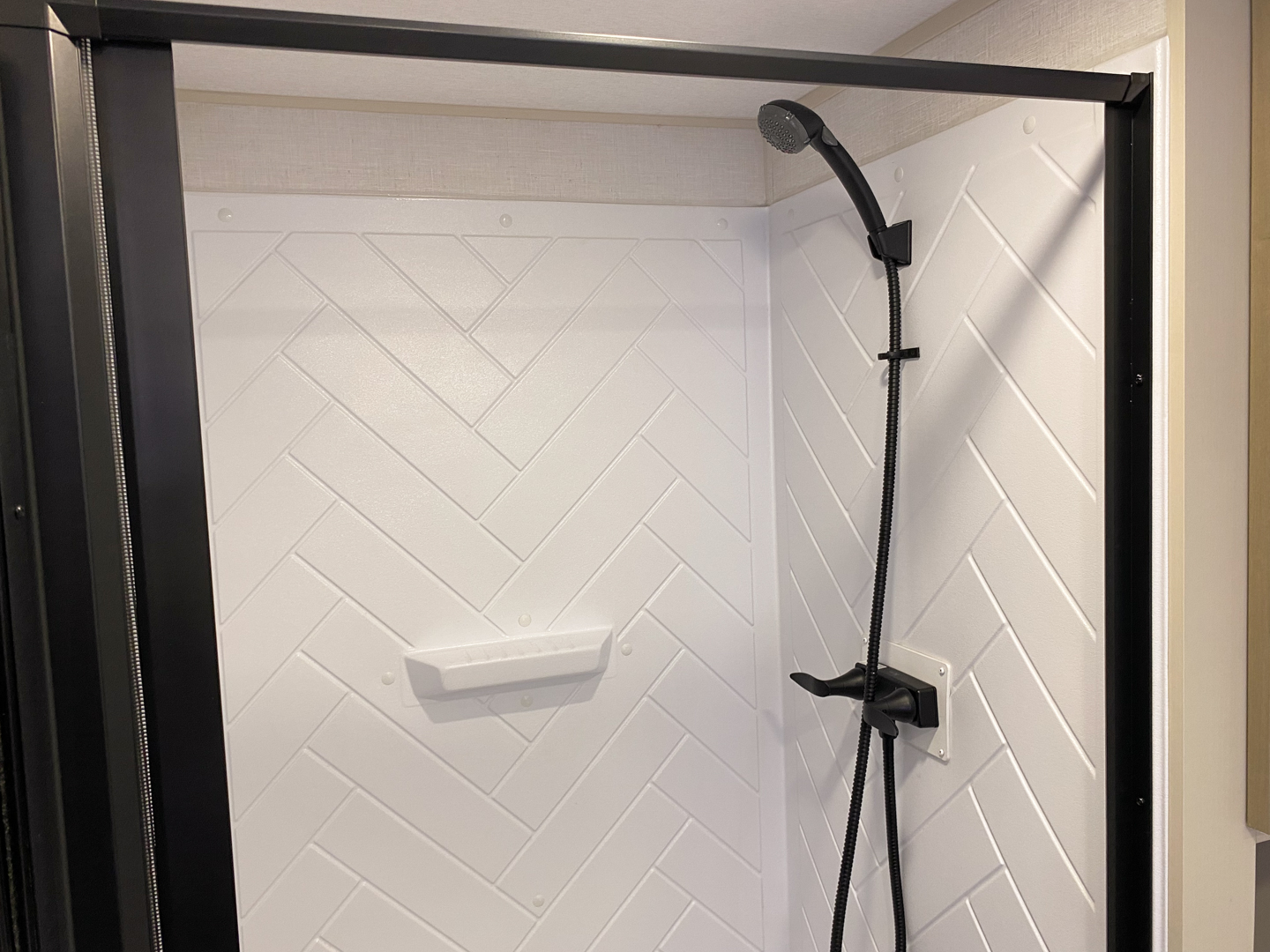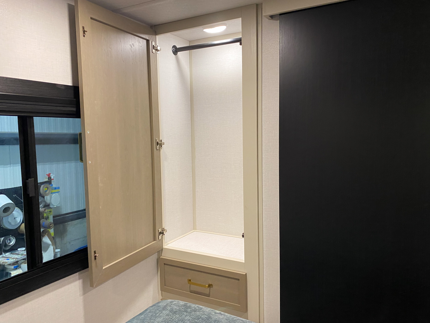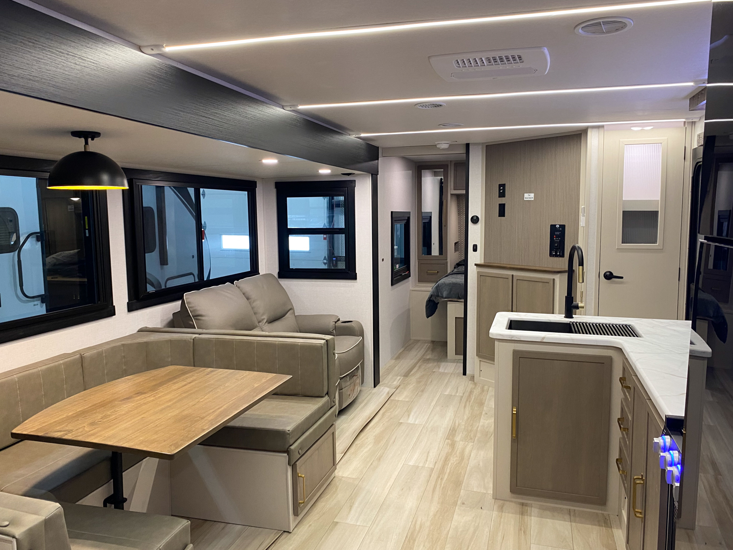 No corners were cut in the 25RBHL. The theater seat (facing the entertainment center) and full-sized dinette separate the best-in-class bathroom and bedroom. 36″ wide sliding barn doors offer complete privacy, or the ability to open the 25RBHL up from front to back. This camper also offers a refrigerator outside underneath the awning.