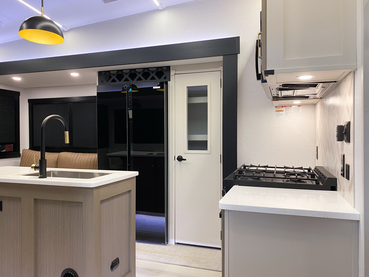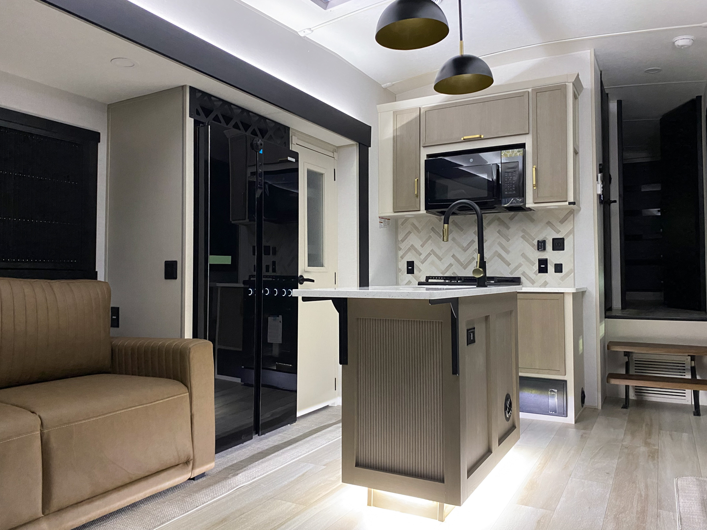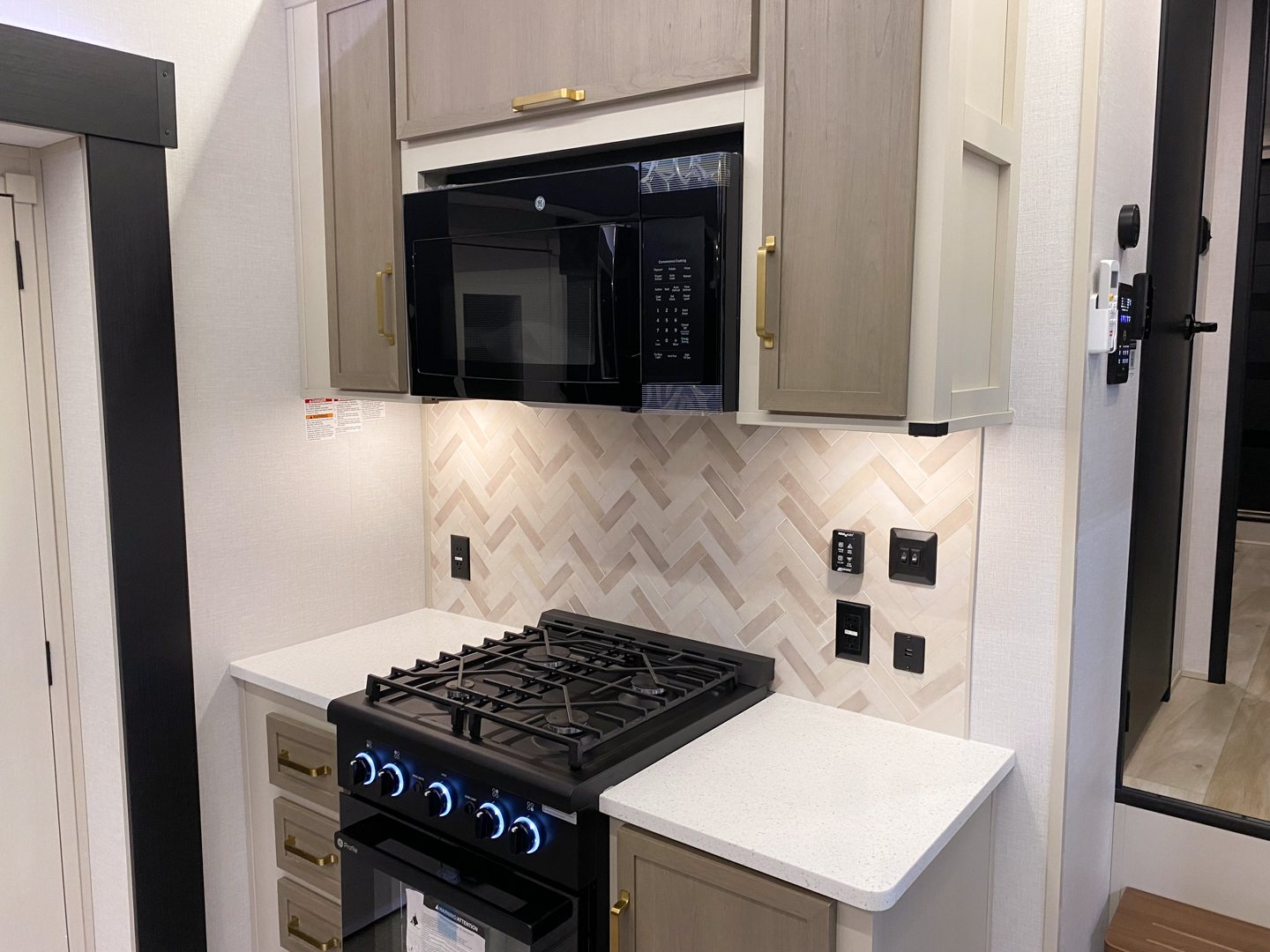 • Saddle Colored Wood Cabinetry with Matte Gold Hardware