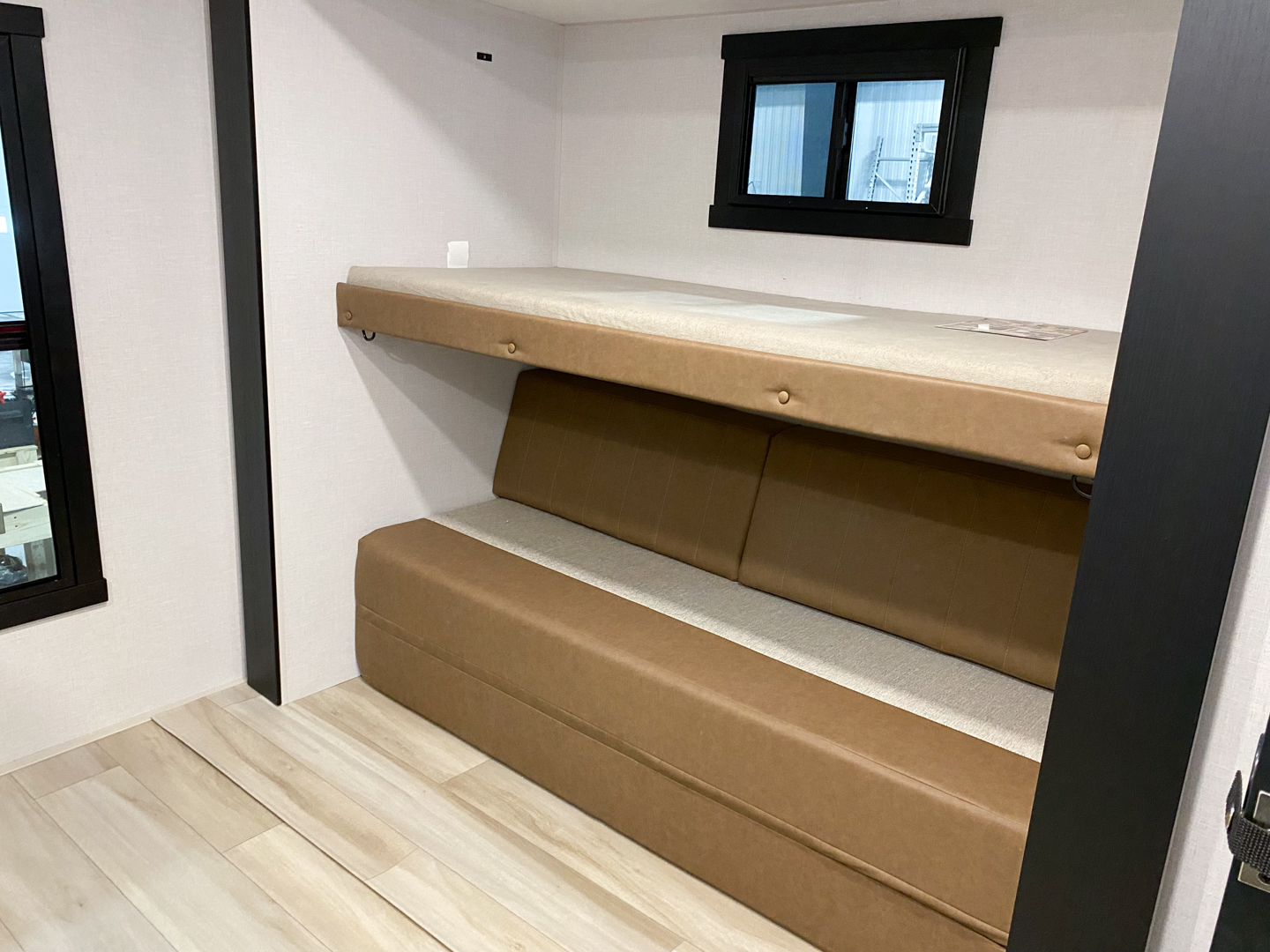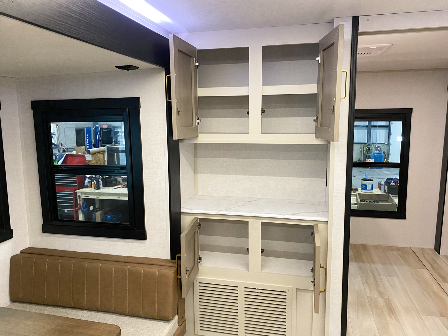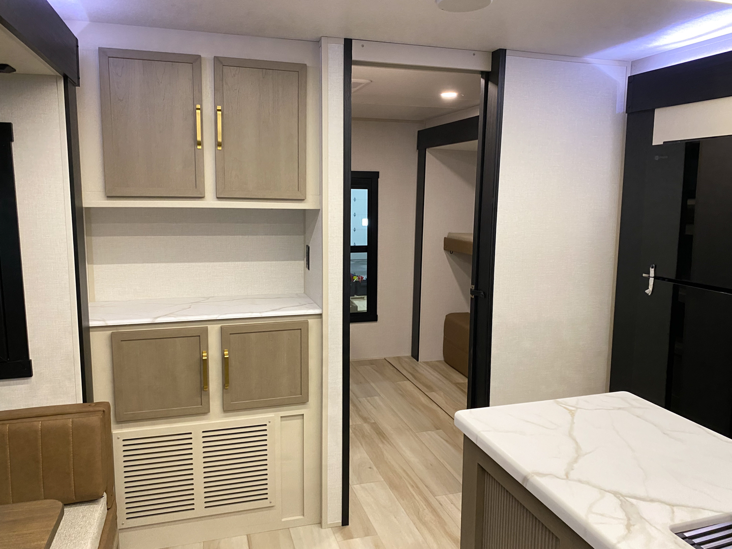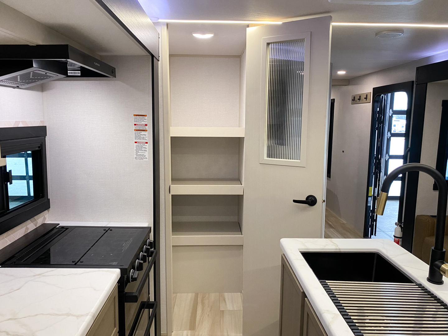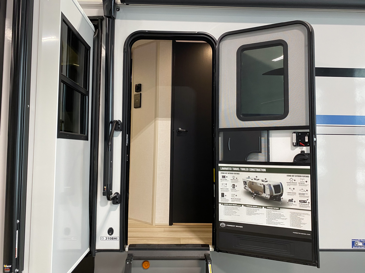Camping with your family shouldn’t require you to sacrifice your living space. With the 310BHI, you don’t have to. This floorplan offers a MASSIVE outside kitchen, direct viewing of your campsite, a standard 50″ TV, and a pantry most houses would dream of. If that wasn’t enough, the 310BHI comes standard with stackable washer/dryer prep thoughtfully located in the bedroom closet/wardrobe.