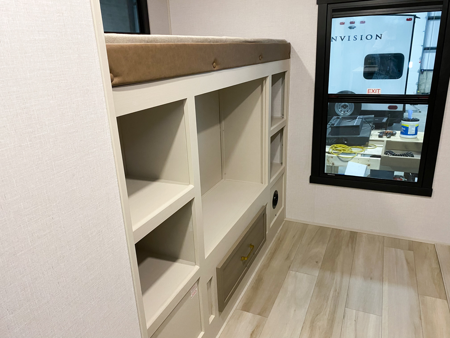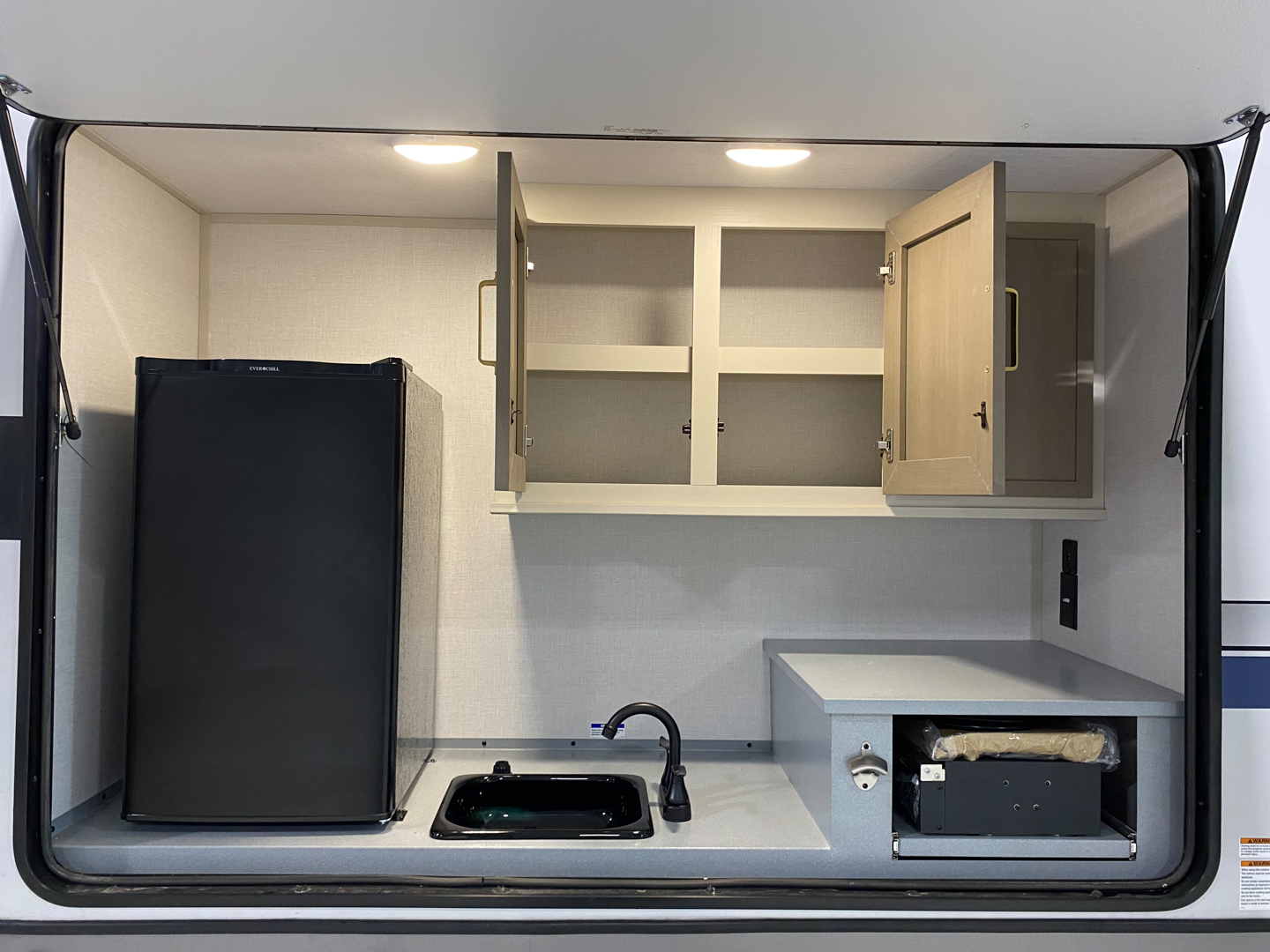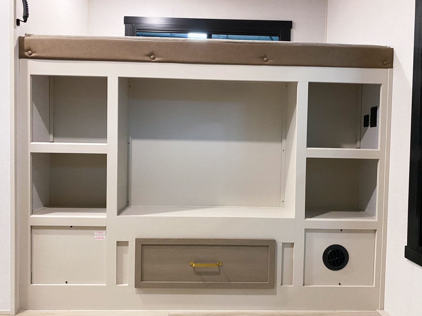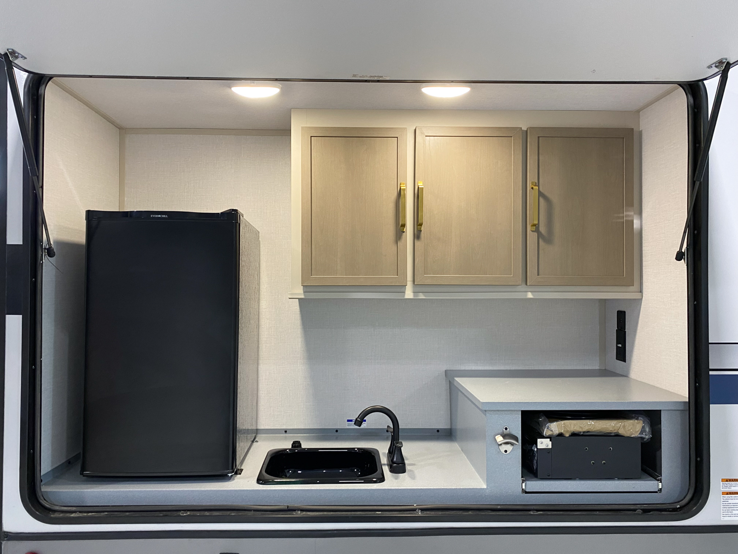 Camping with your family shouldn’t require you to sacrifice your living space. With the 310BHI, you don’t have to. This floorplan offers a MASSIVE outside kitchen, direct viewing of your campsite, a standard 50″ TV, and a pantry most houses would dream of. If that wasn’t enough, the 310BHI comes standard with stackable washer/dryer prep thoughtfully located in the bedroom closet/wardrobe.